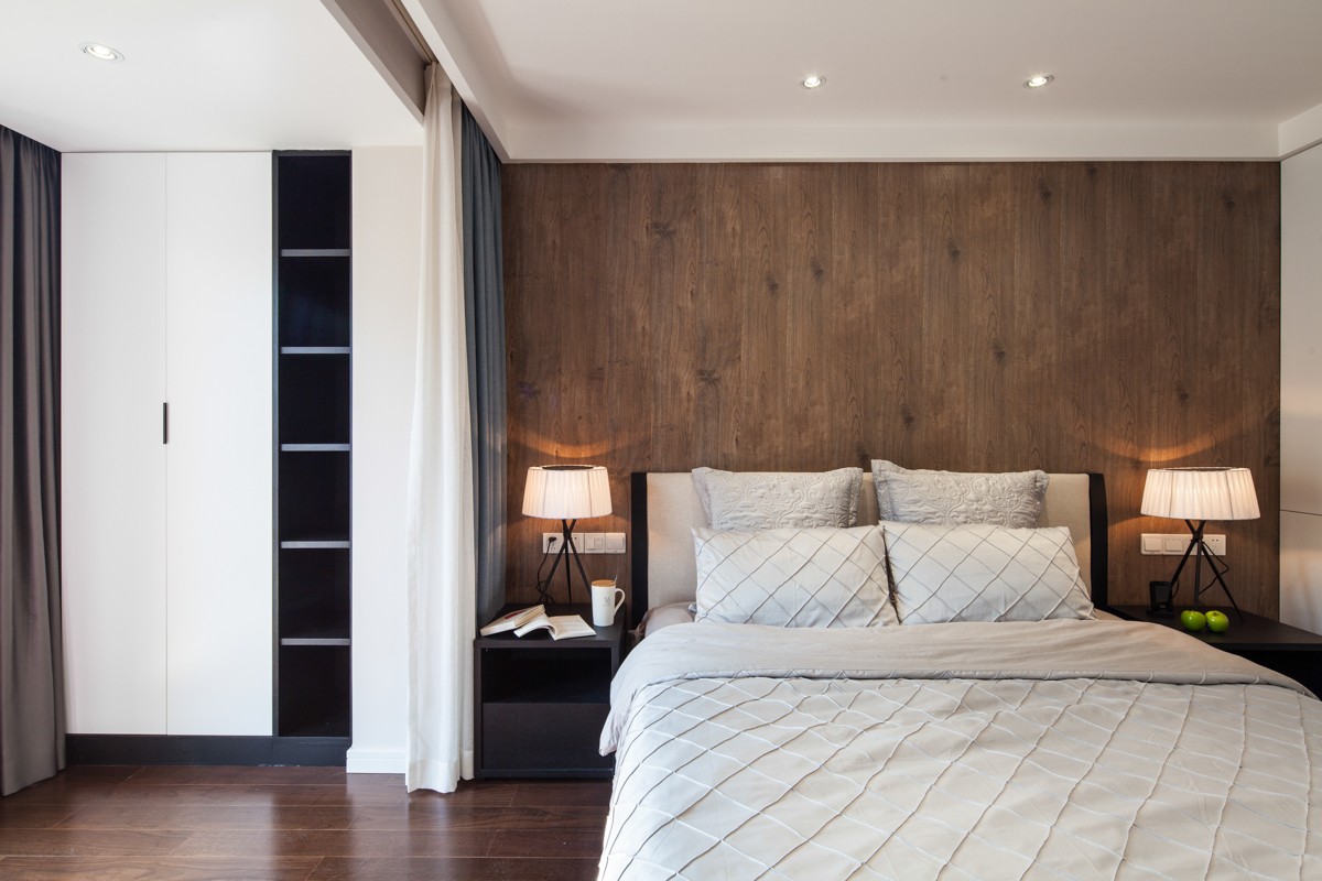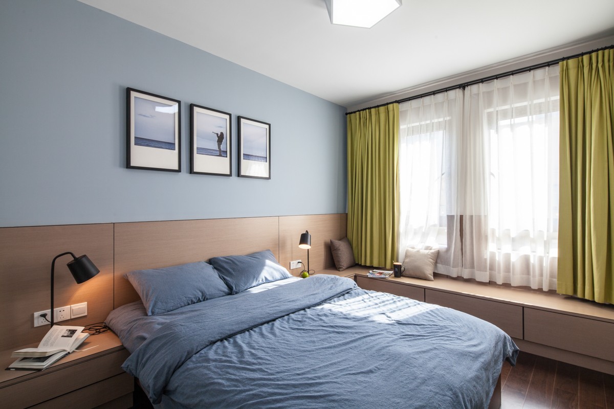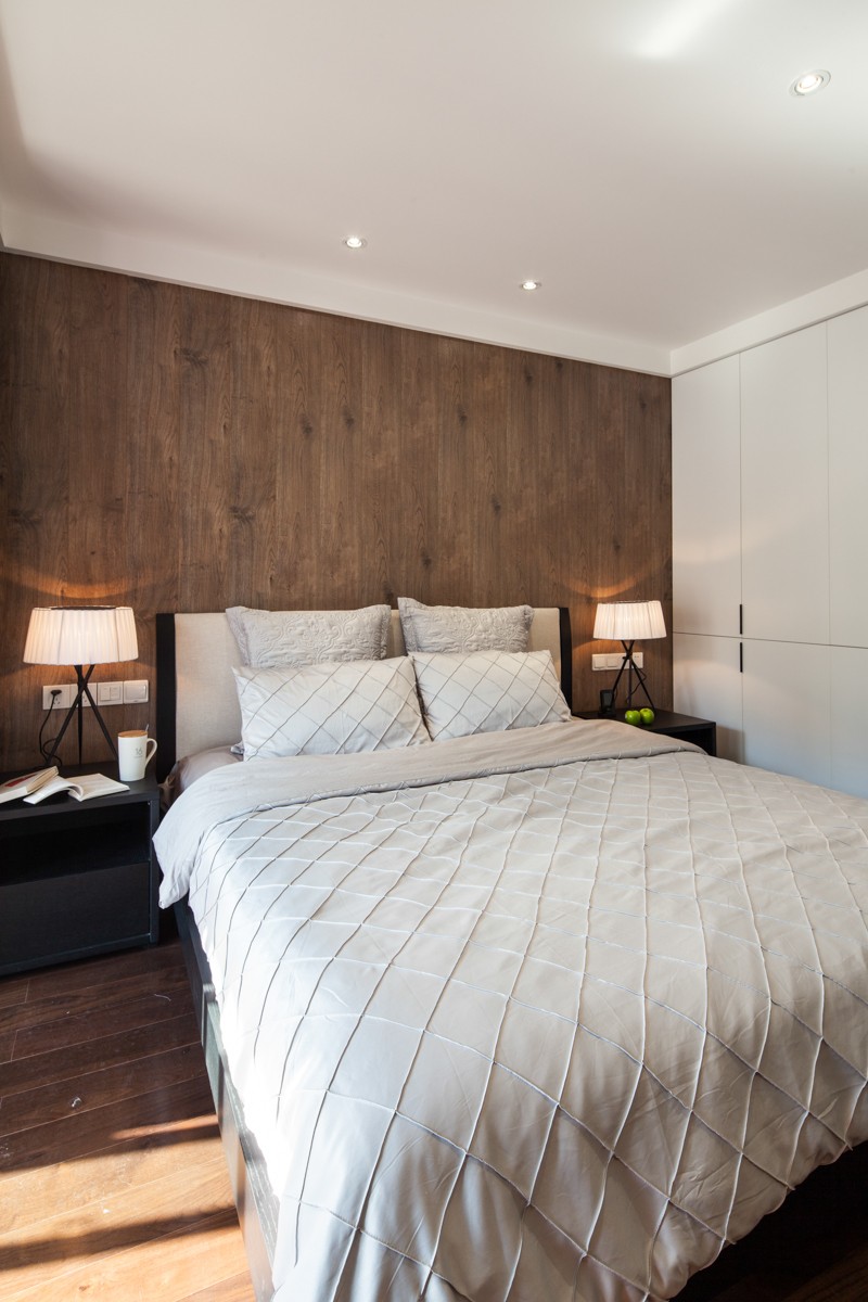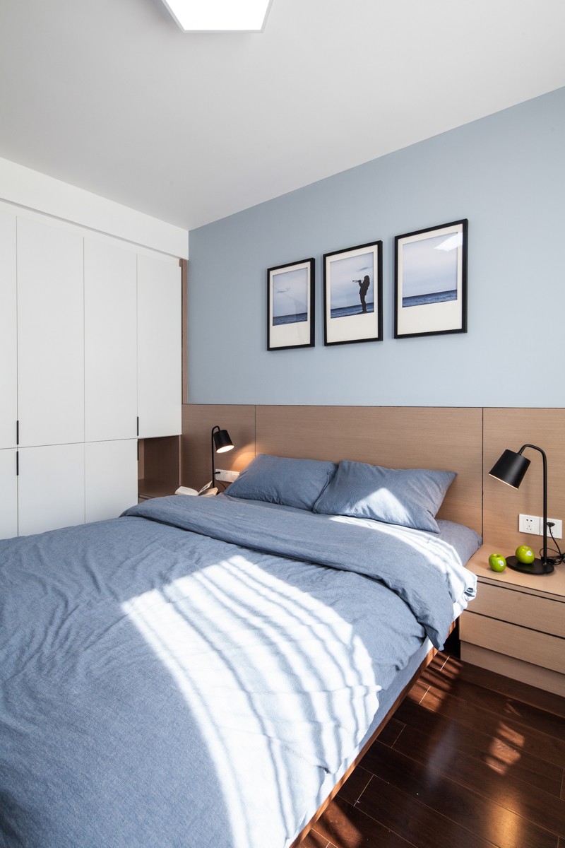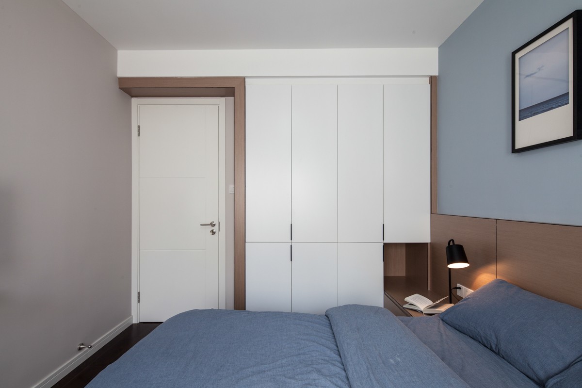 房间两侧均定制整面高柜,满足屋主的衣物、被褥收纳,通风口也与柜体融合,完美地隐藏起来。