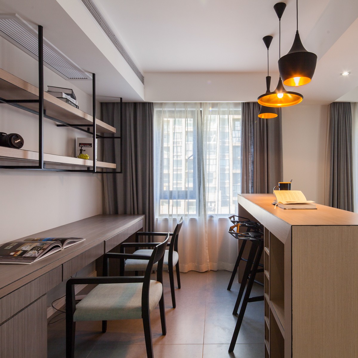 灰色墙顶面形成强烈视觉对比,空间层次更加分明,独特的纹理,也冲淡了纯色的单调冷淡,赋予空间更多变化,升华整体质感。
