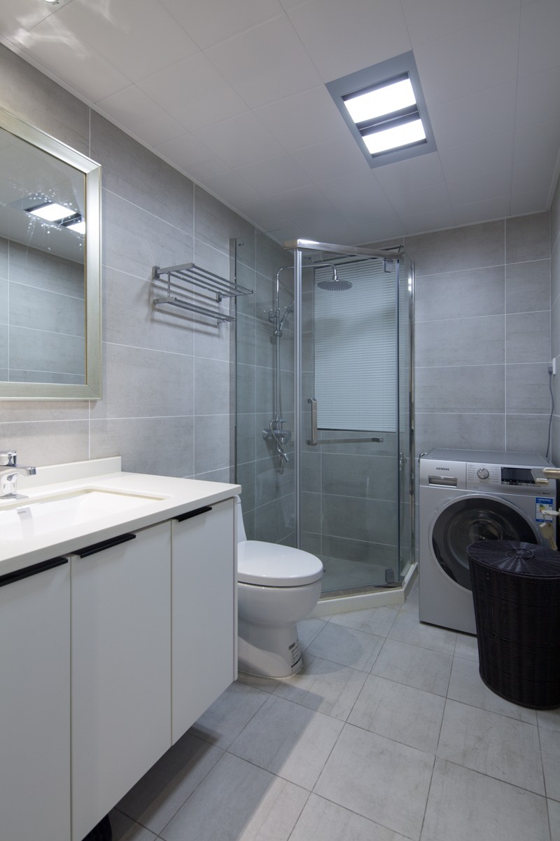 白色墙砖配白色浴室柜,钻石玻璃淋浴房。