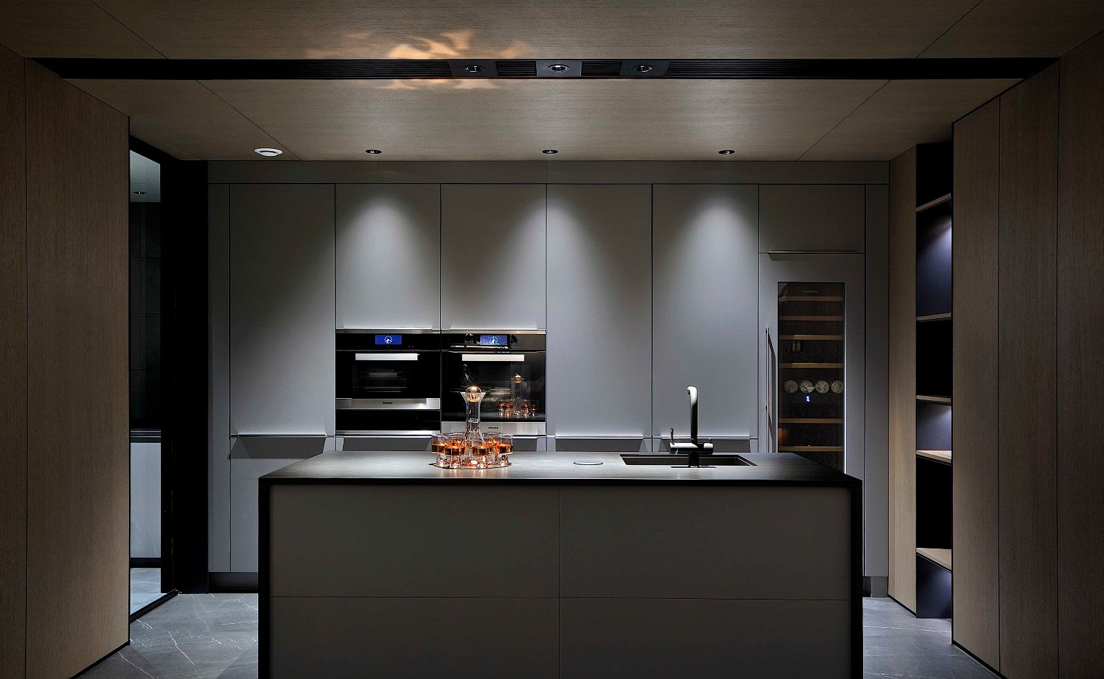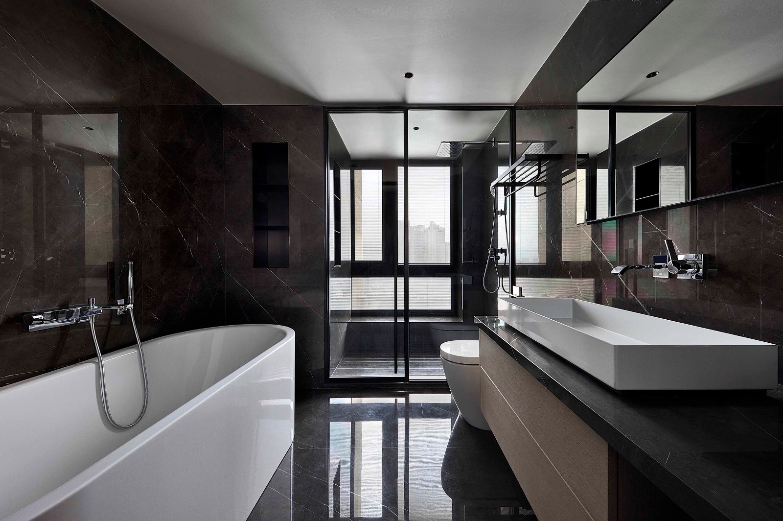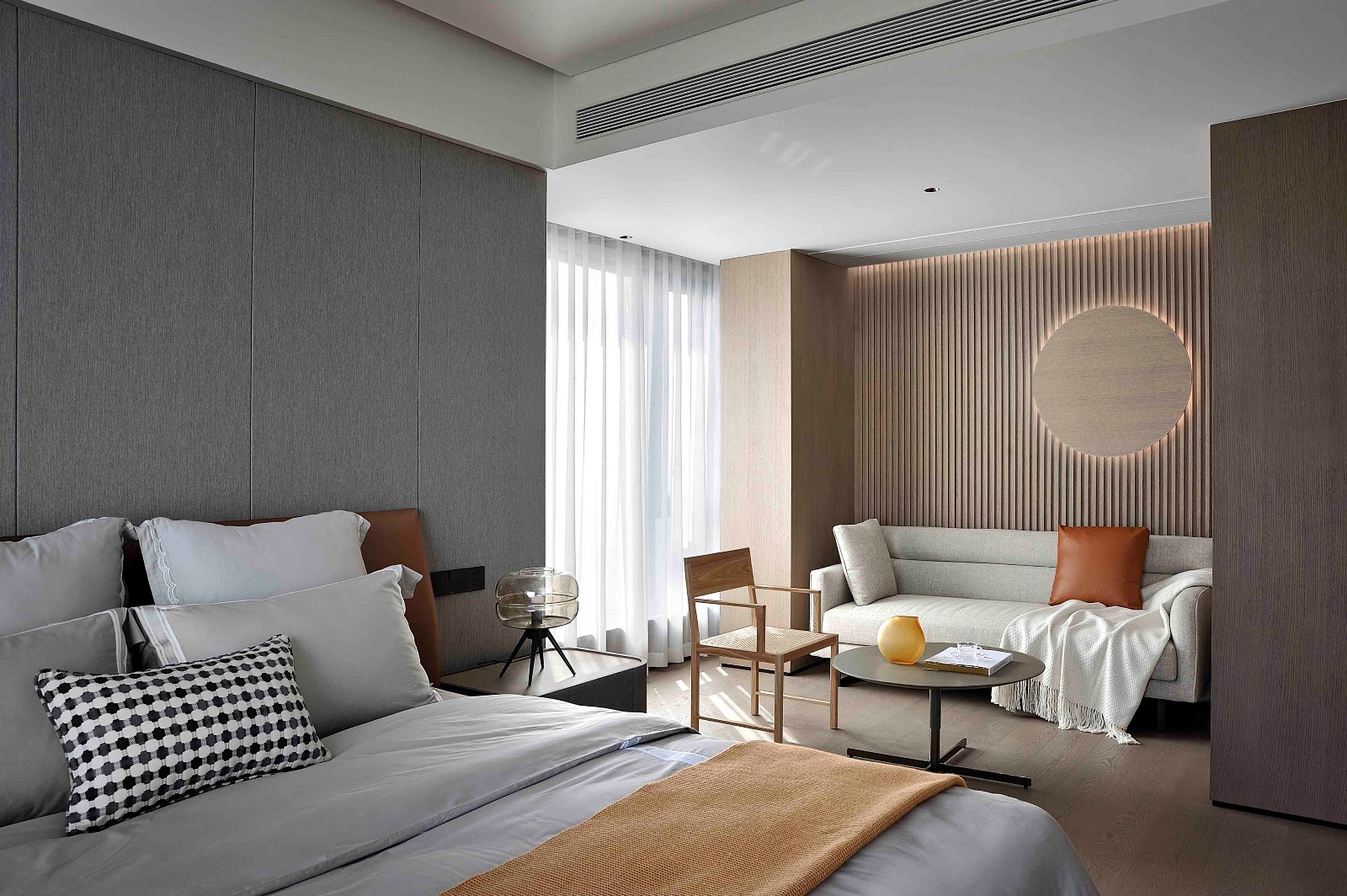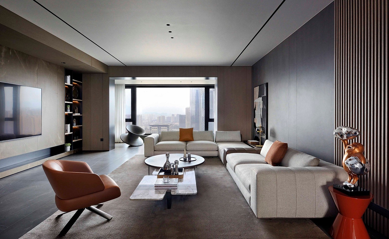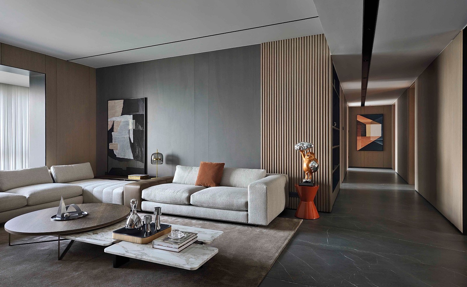 主基调采用大面积的灰色质感元素,同时加入大量的富有情感且温润的木质材料,给深灰色基调的空间升温、柔化,引入大自然的元素,让家更富有情感