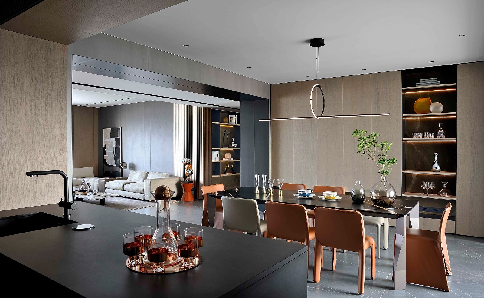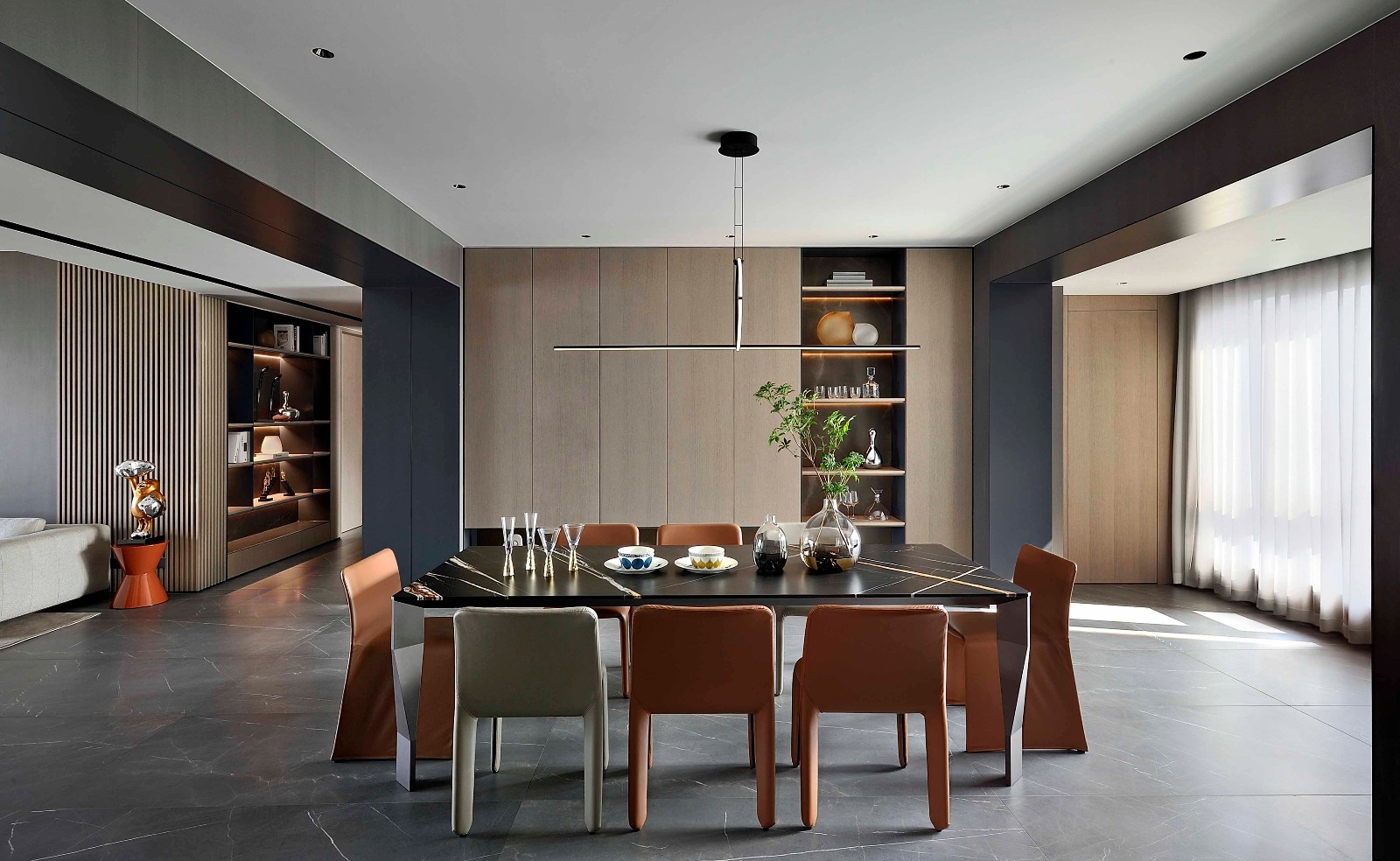 一家人最集中的空间,享受美食的时,多一份沟通,木饰面的运用,让原本的灰度空间增添了温度
