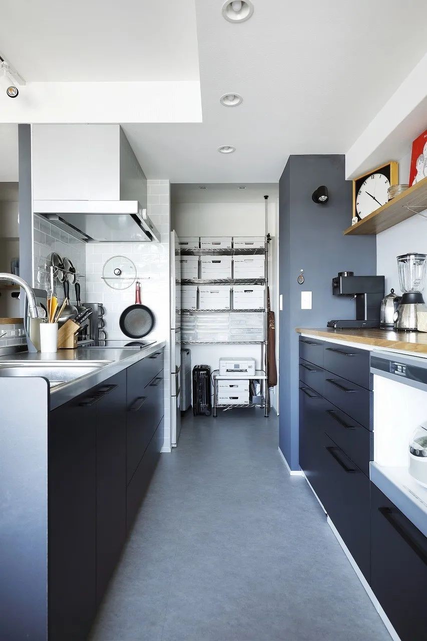 半开放的中岛厨房与客厅用蓝色柜体隔开。厨房内部,收纳区与烹饪区分开。