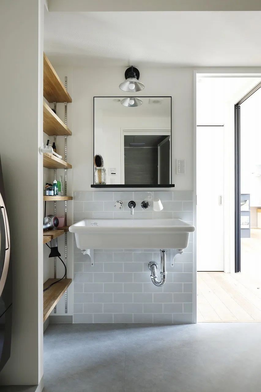 卫浴空间以大面积的白色为主色调,配合原木色的置物架,灵动而不失生气。 洗漱时,左手放置洗漱用品,直观方便。卫生间的洗脸池选用一体盆,方便地面清理。