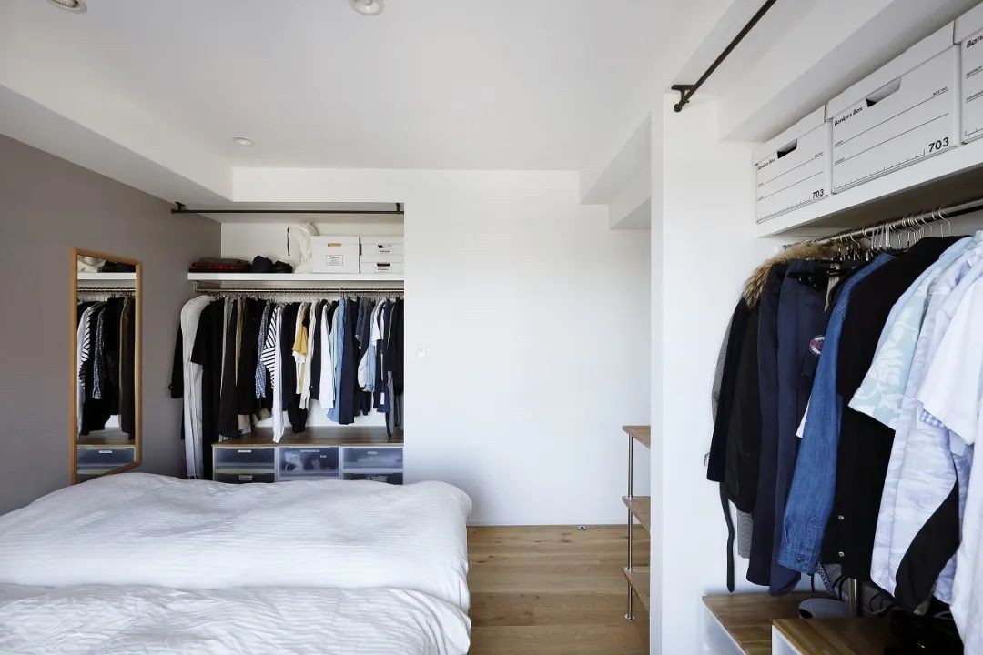 公寓偏简约现代风,颜色搭配采用莫兰迪色系的蓝与白色结合,干净清爽。功能分区明显,收纳很棒。 整个空间***的特点是尽量不使用封闭式柜体,所有用来收纳的地方都是敞开式无柜体的设计,利用墙体和隔板交接出收纳空间,给人眼前一亮的感觉。