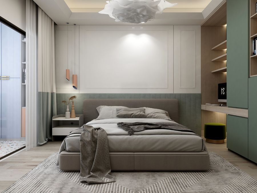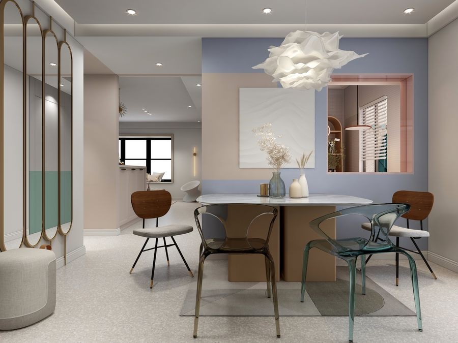 空间以低饱和度色彩搭配亮色点缀,果绿色,藕粉色,姜黄色以清新的色调凸出空间的层次感!设计师以开放式的空间布局手法限度打开横向空间,让居住者在不同空间产生丰富的视线以及情感交流;融合多种材质元素,通过色彩与光影的运用,诠释生活的个性与温度。