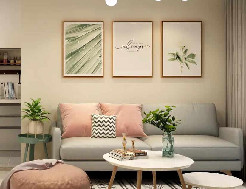 沙发背景墙没有复杂的造型,主要由三联画进行点缀,旁边的绿植让整个空间更加放松。