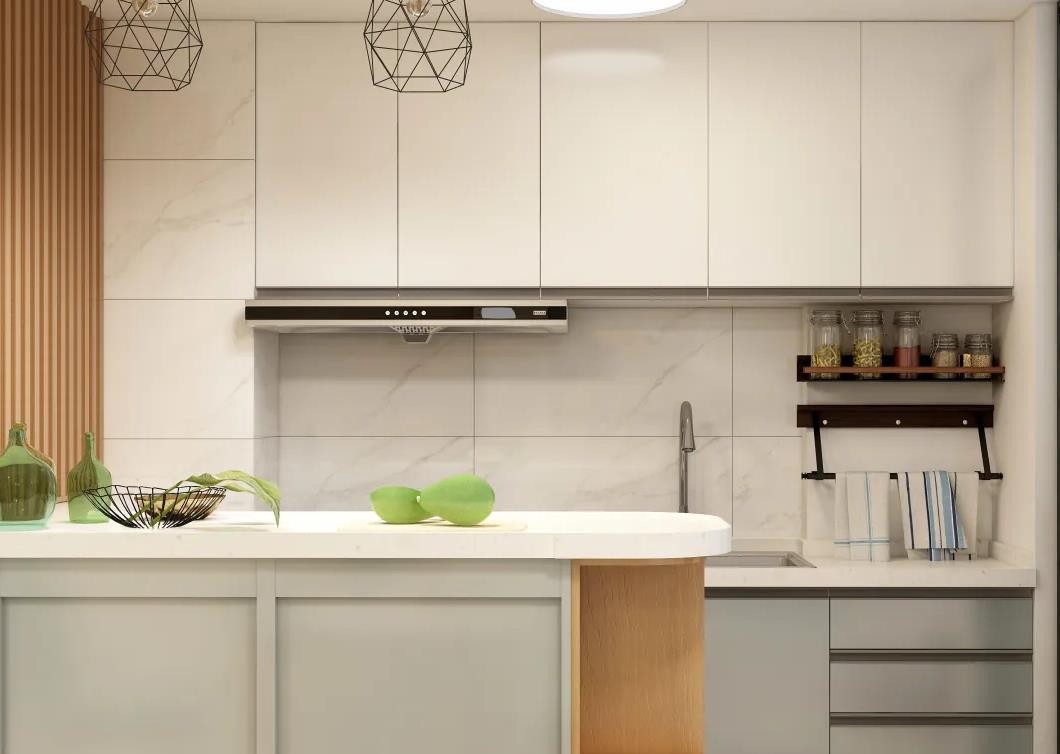 由于空间有限,厨房设计了开放式厨房,便于操作,增加了操作台面以及储物空间。