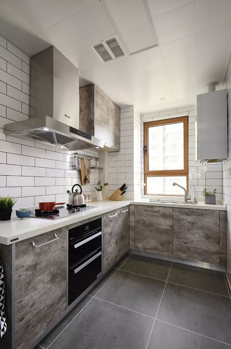 厨房在灰色地面砖与仿古灰色的橱柜空间基调,搭配白色的墙面砖,显得文艺而又有个性。