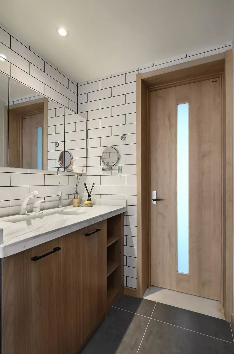 进入卫生间,首先是洗手盆区域,木质柜体与大理石质感的台面,结合白色墙面砖与水龙头,显得简单舒适好精致。