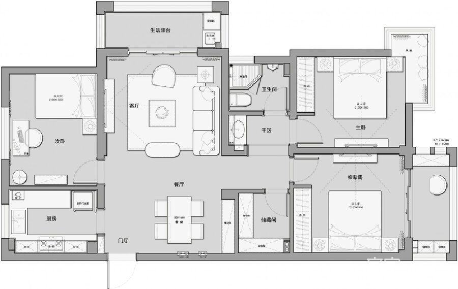 厨房空间有限,我们拓展了厨房使用面积,用无地轨移门形式,方便老人使用, 利用隔墙增加了入户鞋 柜存储空间。 客餐厅保留原始空间,餐厅侧墙取消,餐边柜内置,增加便捷功能性。 干区围合出壁龛空间,增加了干区实用性。 取消一个暗卫,取而代之增加一个大的储藏间,满足老人家杂物收纳使用。 原主卧改成长辈房,卧室空间独立使用,将长辈房放在靠南阳台的卧室也是为了生活的便利考虑。