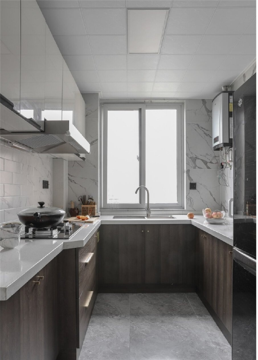 墙面整体鱼肚白纹理瓷砖,吊柜与地柜之间选用了大理石纹理的面包砖,同样都是温润的哑光效果,让厨房不会显得那么冰冷,地面砖选用了哑光灰色的大理石纹理砖,耐脏同时便于打理。