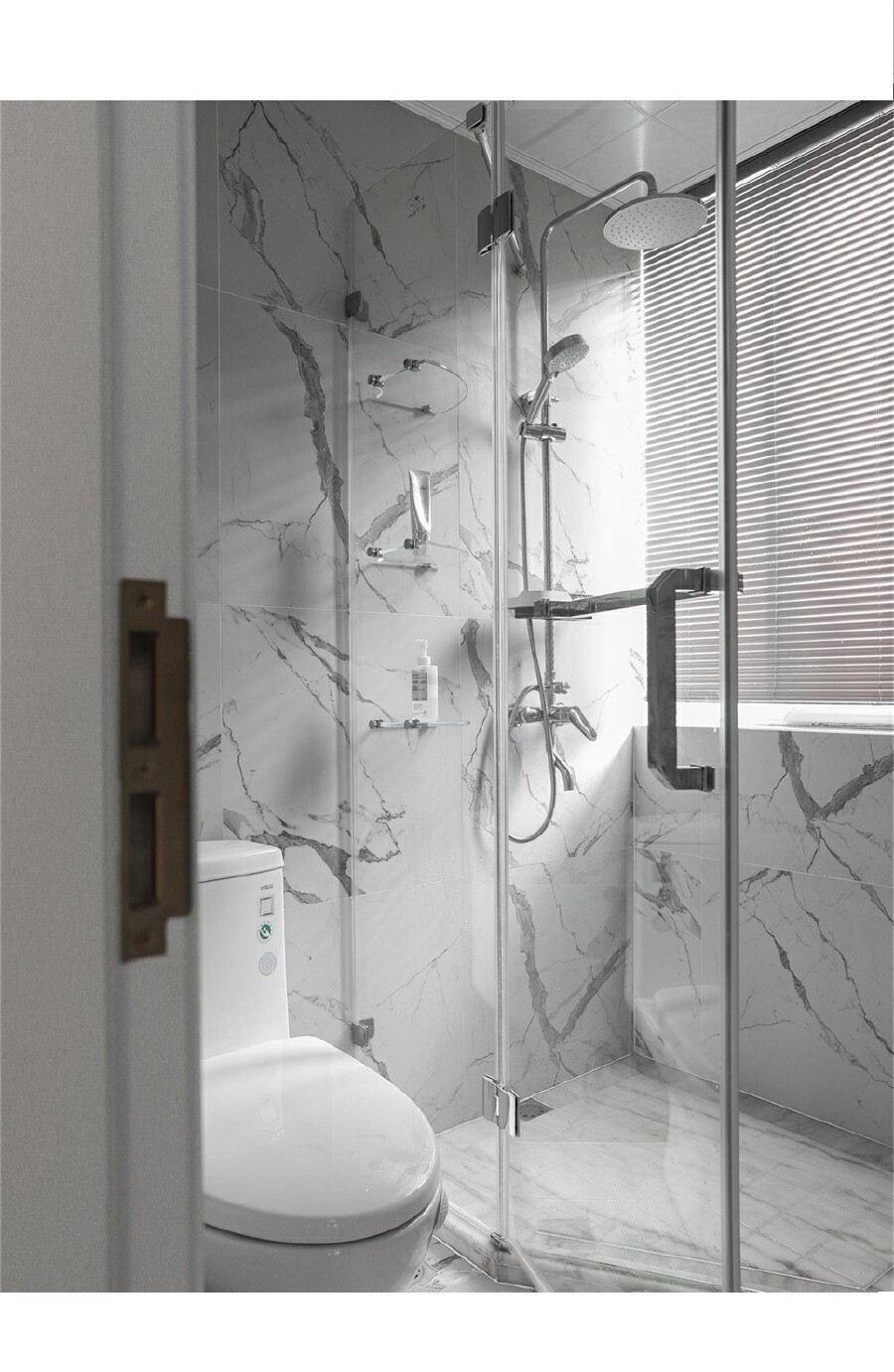 卫生间门,定制了长虹玻璃,造型更加精致细腻,同时具有一定的透光性,门上的英文标识,复古精致。