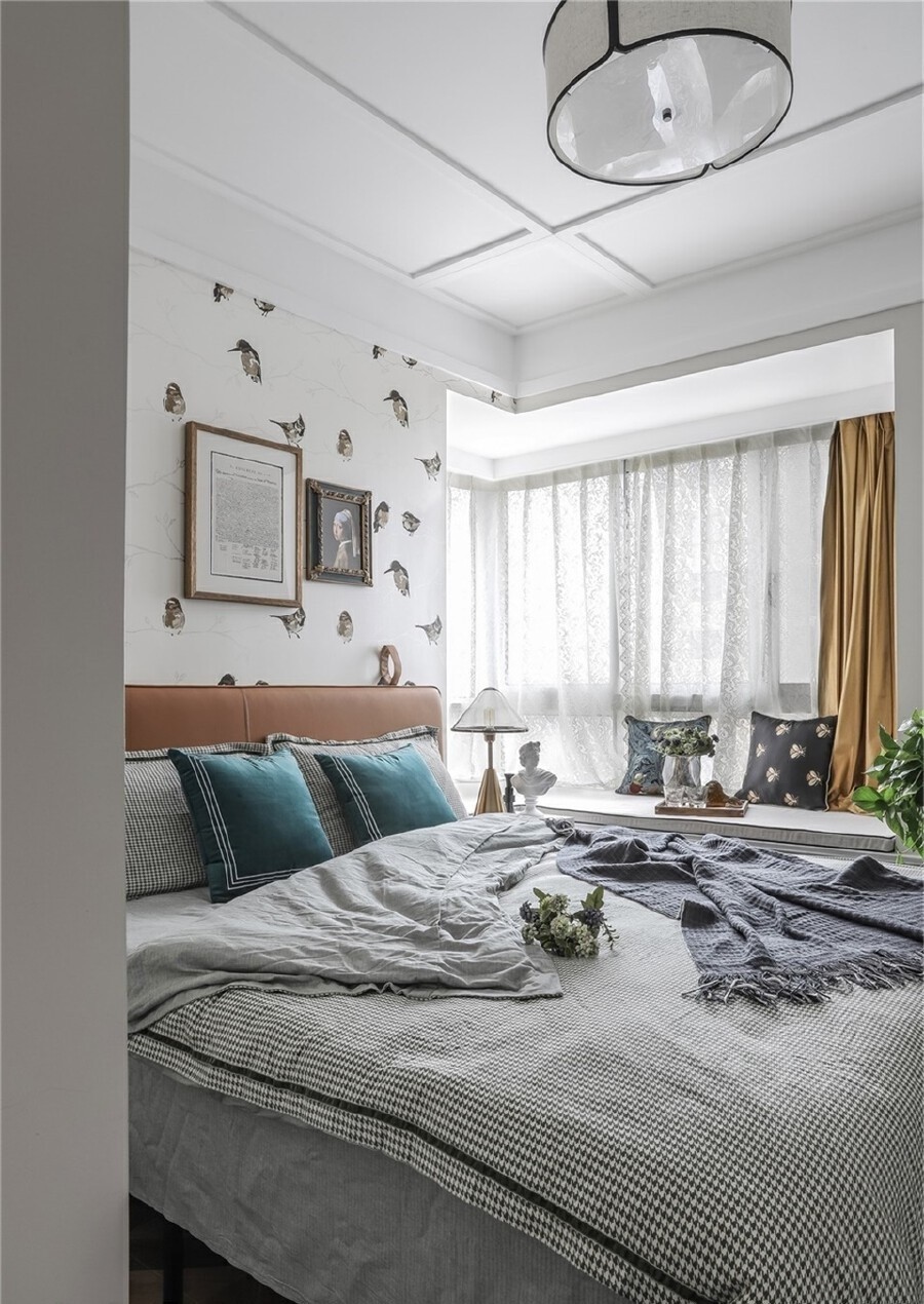 卧室是给父母的房间,用色整体明亮鲜艳一些,床背与窗帘选用了橙色与鹅黄的搭配,L形的大飘窗,让阳光透过唯美“珍珠蕾丝提花纱帘”充沛得照入屋内,重塑了内心和灵魂的美好