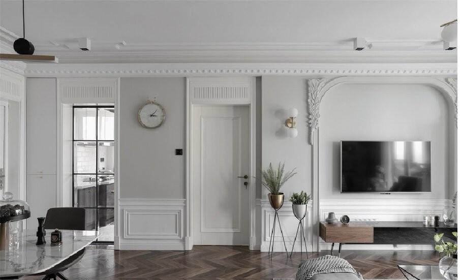 客厅整个空间,色彩表达素雅,以白色和浅灰色为基调,地面选用胡桃木色鱼骨拼地板,饱满沉稳,有很好的居住舒适感。墙面下裙与上墙灰色乳胶漆区分开来,使用PU线条做双层腰线,中间围合制作框线,白色乳胶漆饰面,有半高护墙板既视感
