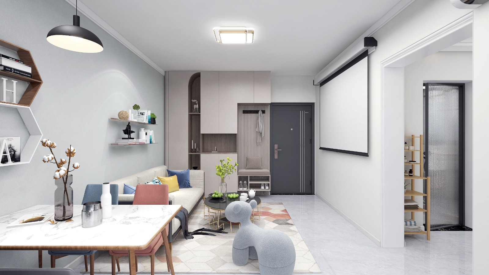 由于户型限制,将传统的电视柜改为投影幕布,使得空间动线更好