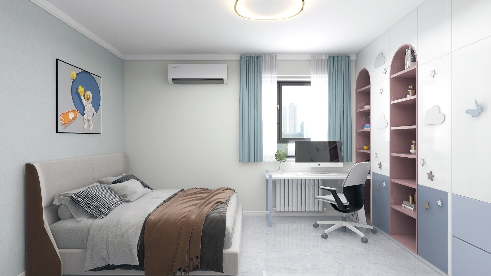 儿童房一整面墙衣柜书柜延伸书桌,满足储物盒学习的功能