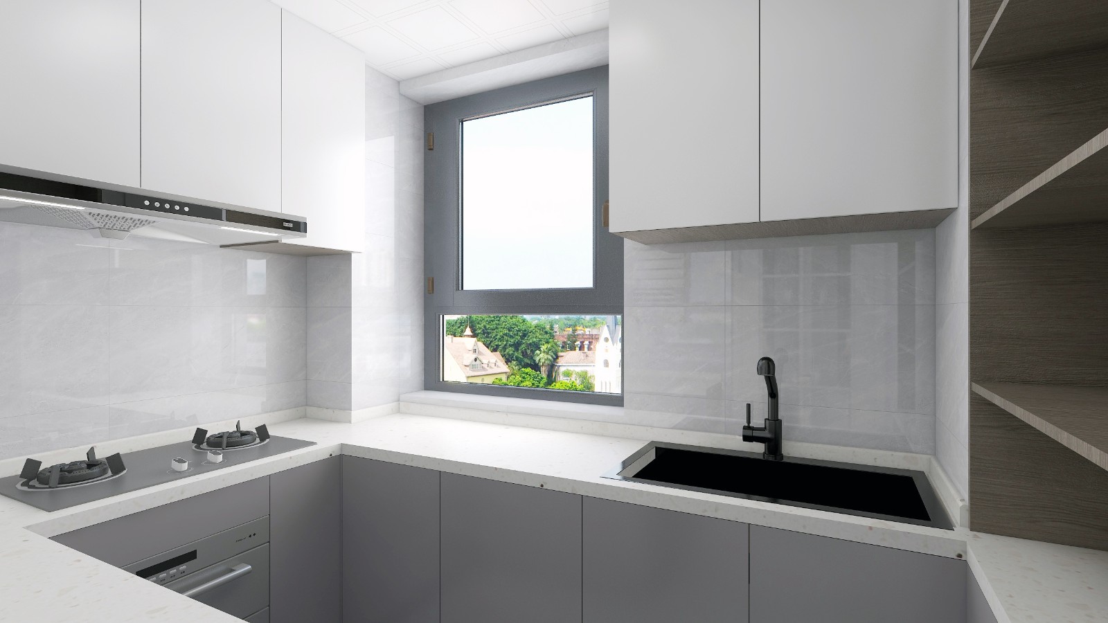 将原本的灶台和水盆互换位置,并将原厨房通阳台的门洞封堵和嵌入橱柜,使得厨房的储物空间增加50%