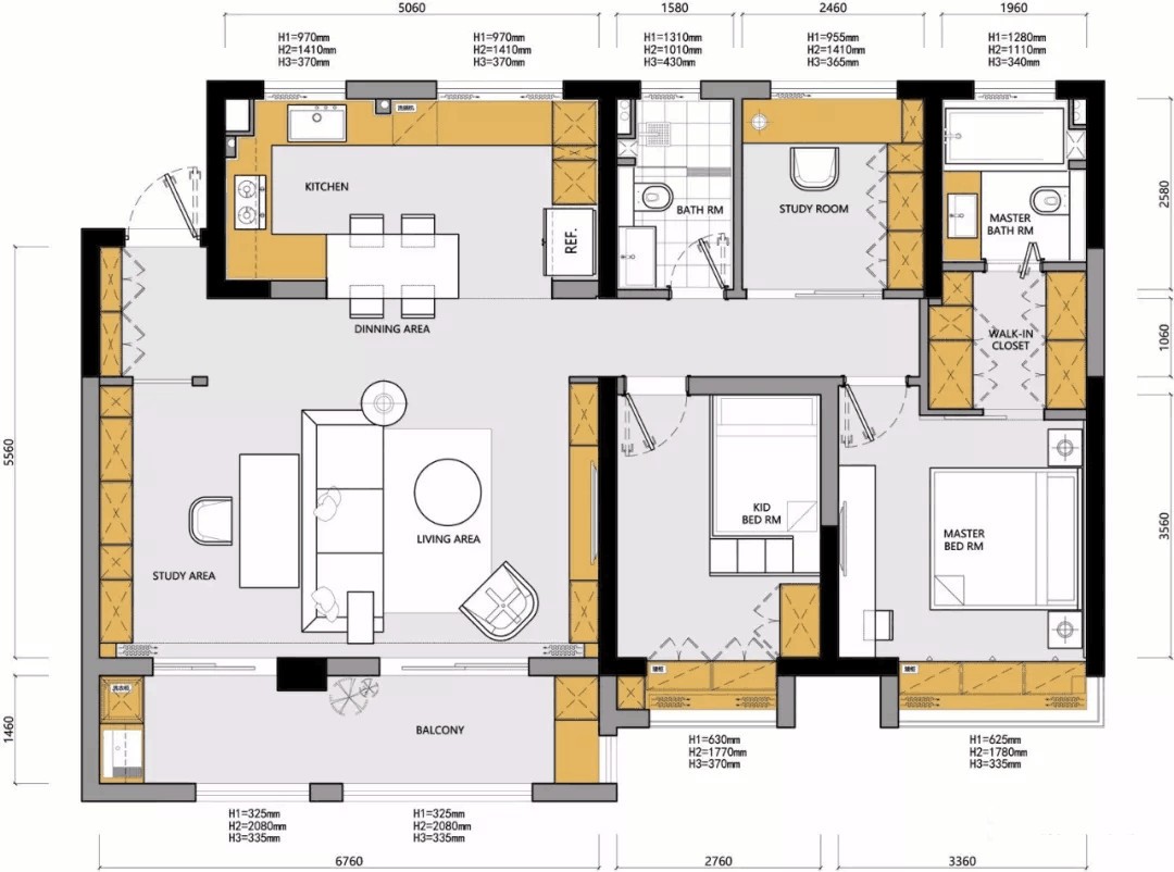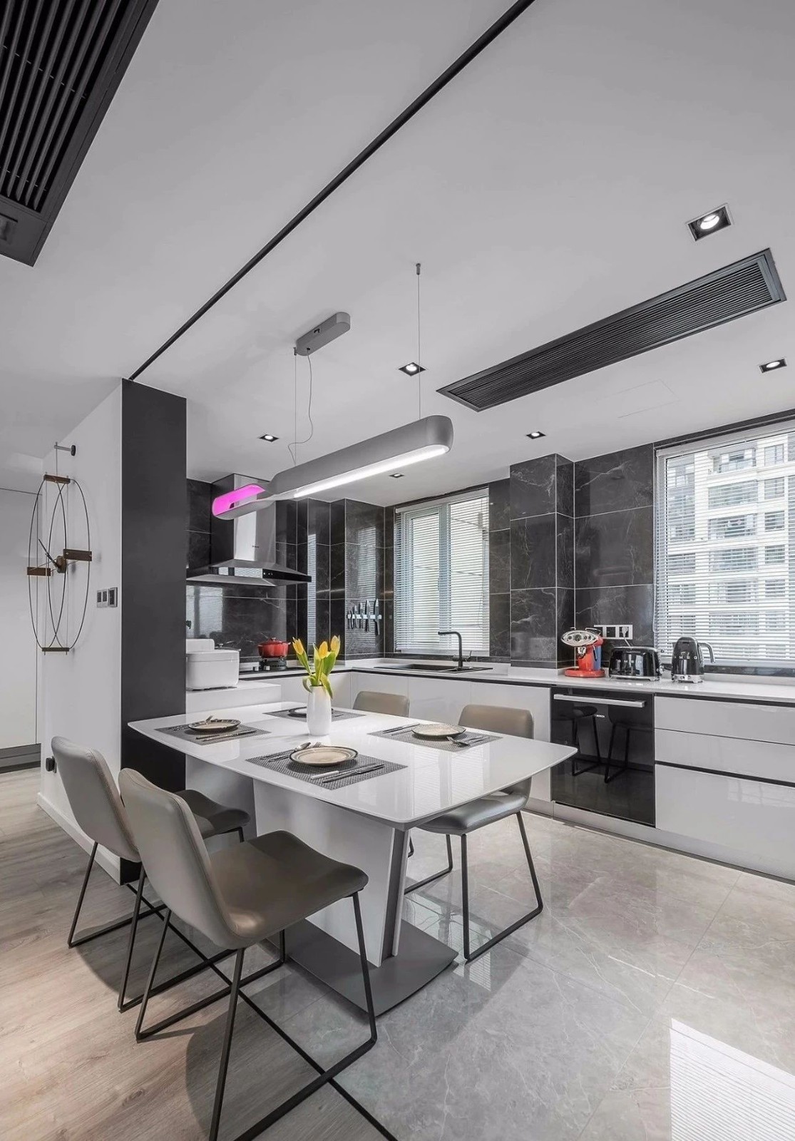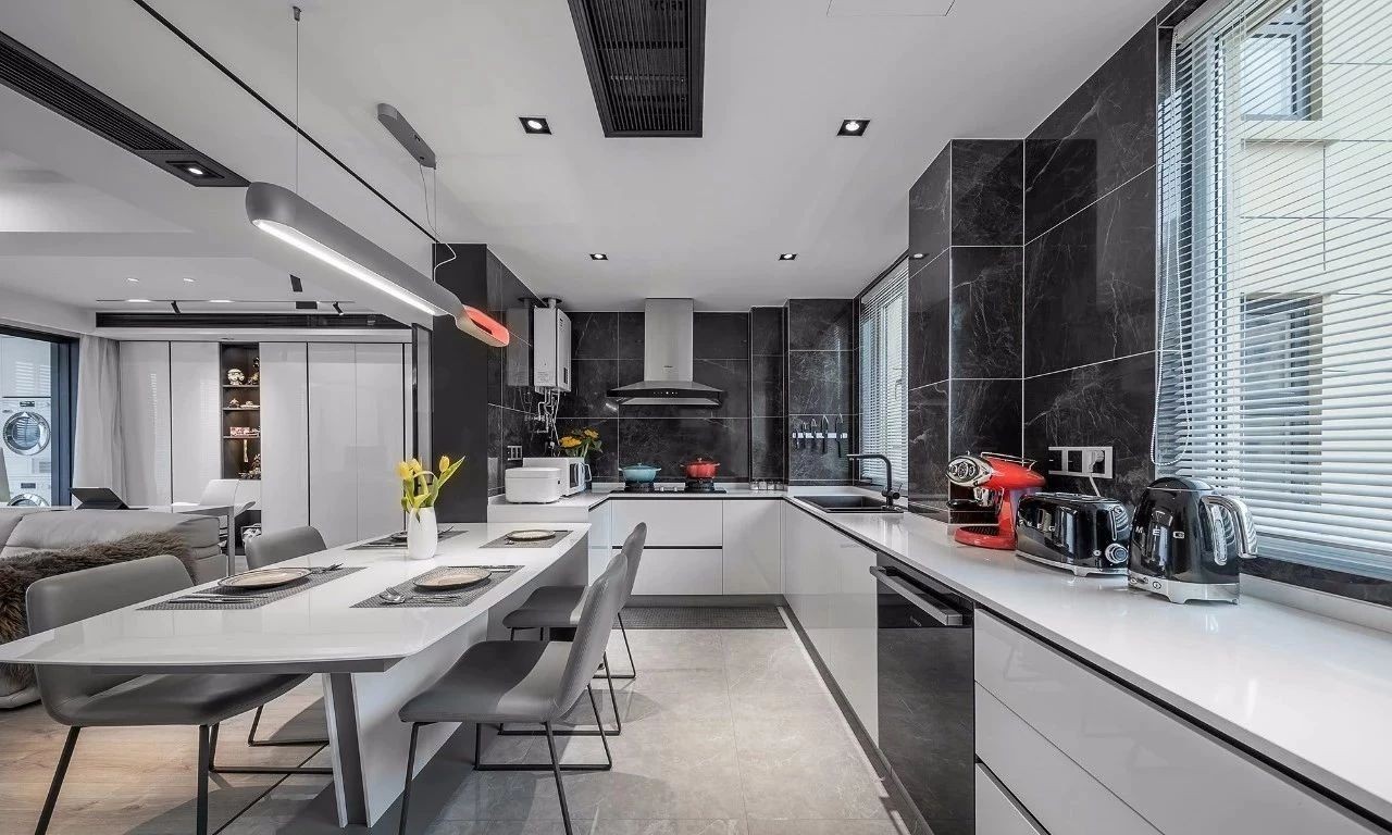 开放式厨房结合餐厅设计,连接客厅与书房,在做饭的同时还能与其他区域的家人互动。