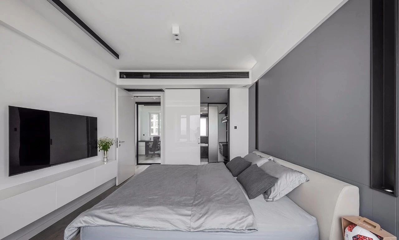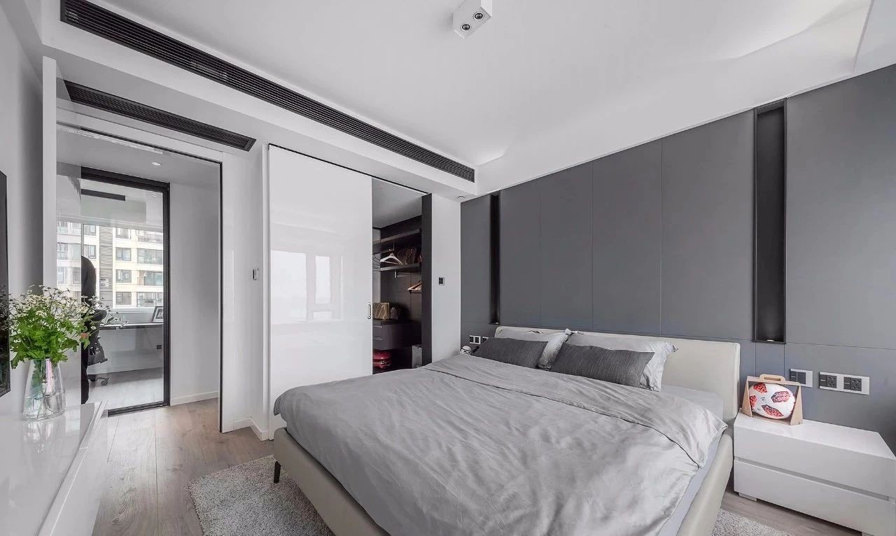 主卧整体用色与风格延续黑白灰简约格调,木地板配无主灯顶面,灰色硬包嵌入黑色金属凹槽,空间线条简洁利落。