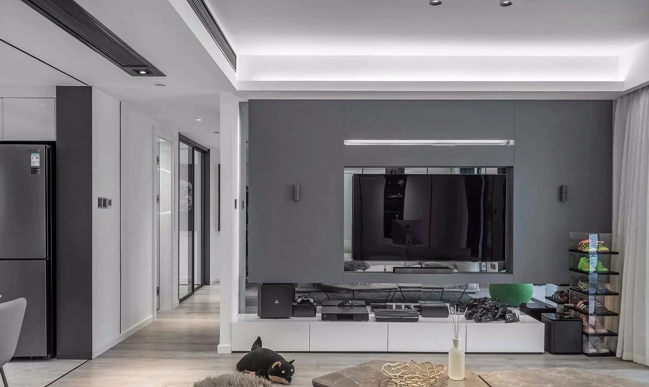 电视柜采用落地式,下口全定制抽屉,电视墙面由灰色烤漆板定制而成,侧面做装饰灯带修饰,右边业主收藏的球鞋也成为空间装饰。