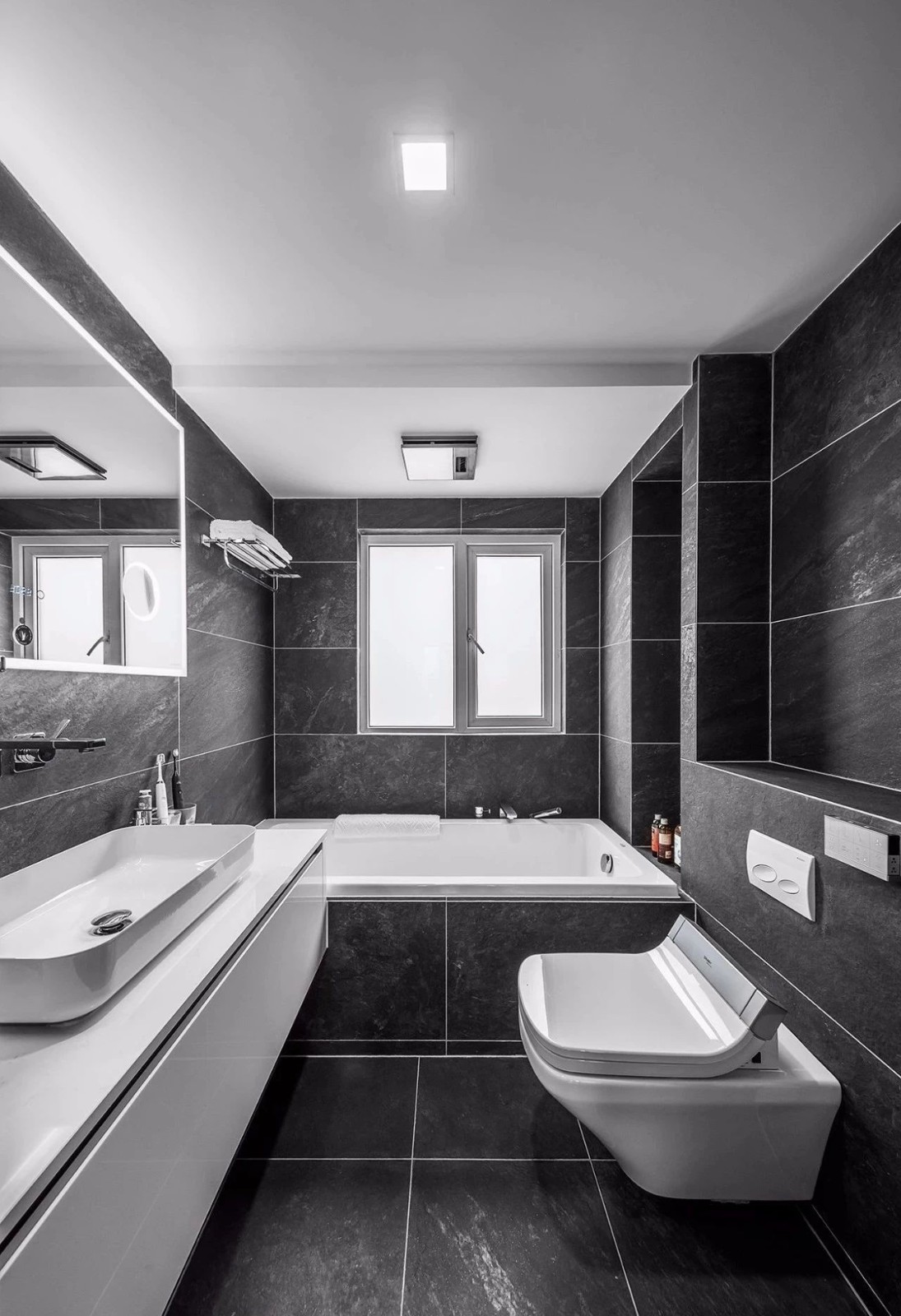 主卫墙地一体通铺黑色瓷砖,配置杜拉维特智能壁挂马桶,白色台盆柜,台上盆配置墙排龙头,时尚又现代。