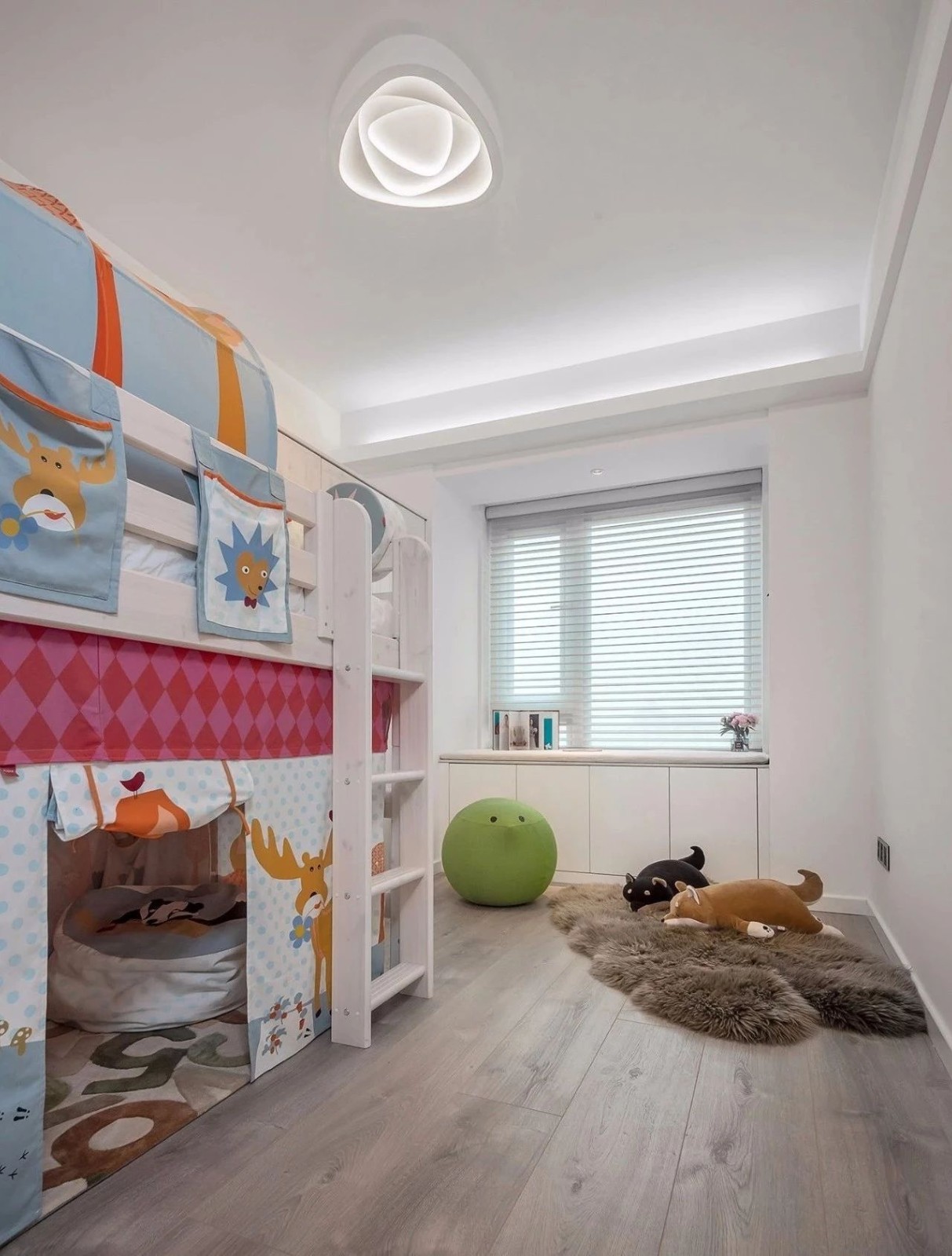 儿童房留白空间搭配木地板,仅放置床和衣橱,更多空间供孩子玩耍,飘窗改造成储物柜,简洁又实用。
