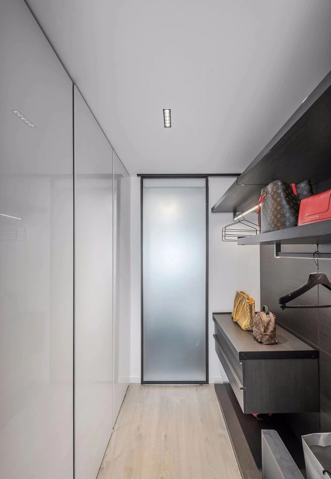衣帽间用磨砂玻璃移门隔开,内部设置自动感应灯,两侧不同的柜体,满足不同的收纳需要。