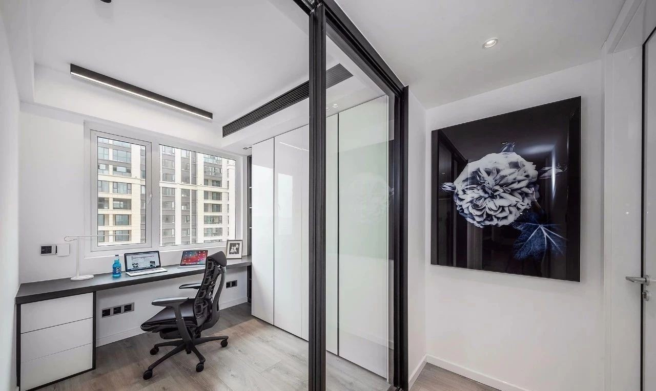 书房采用透明玻璃移门,确保了过道采光需要,与书桌连接的侧面置顶柜体,增添整室收纳。