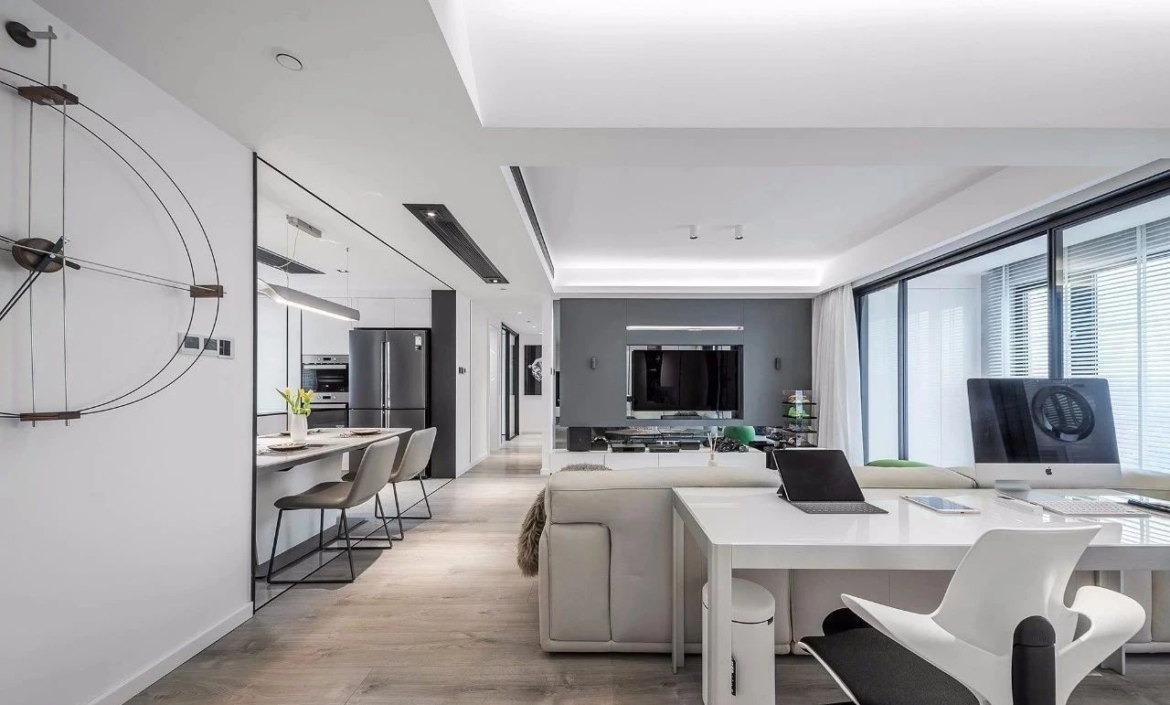 套内面积120平,简约风三口之家。入户视线正对南阳台,设计金属框架的玻璃屏风,缓冲视线,解决进门对阳台的问题。