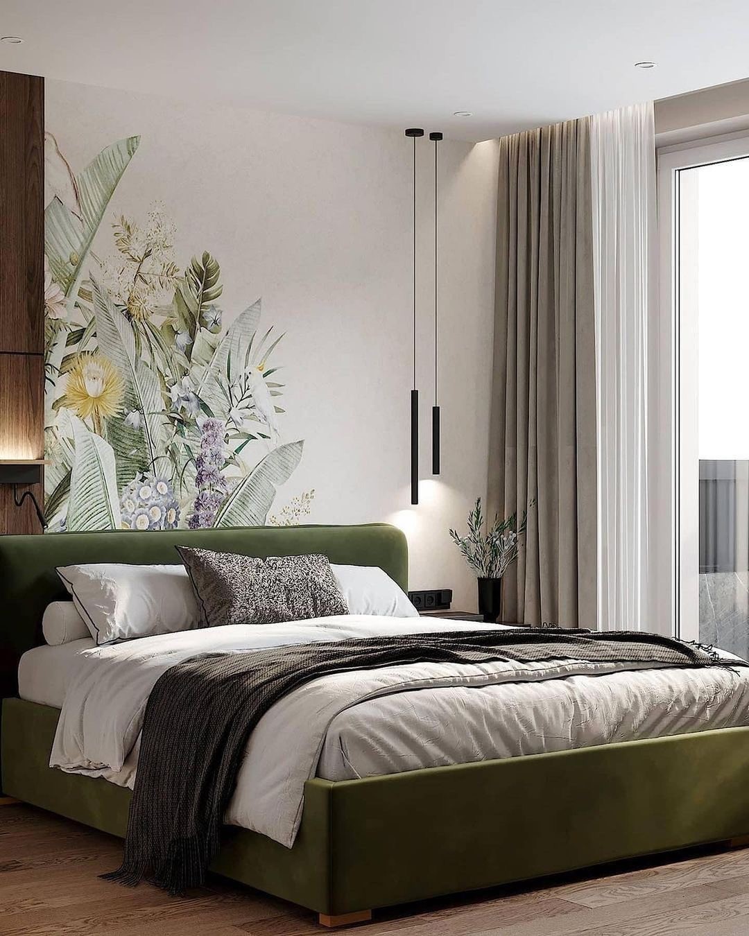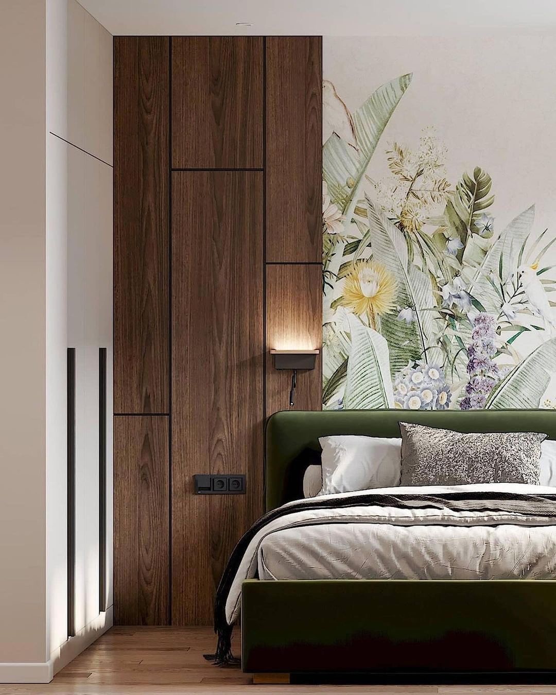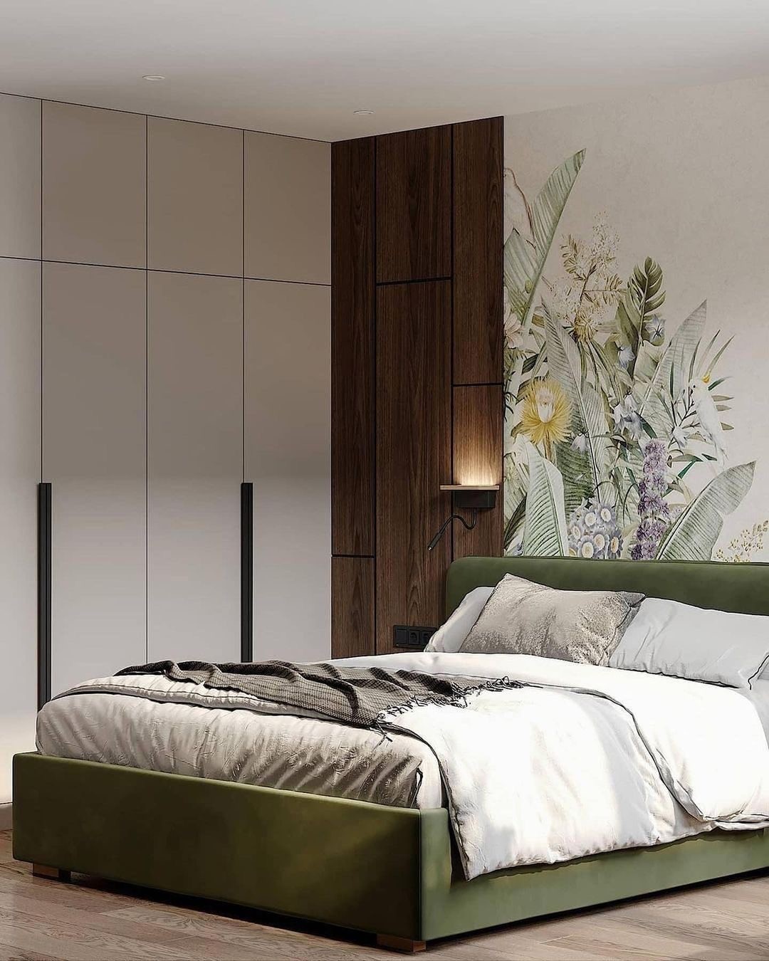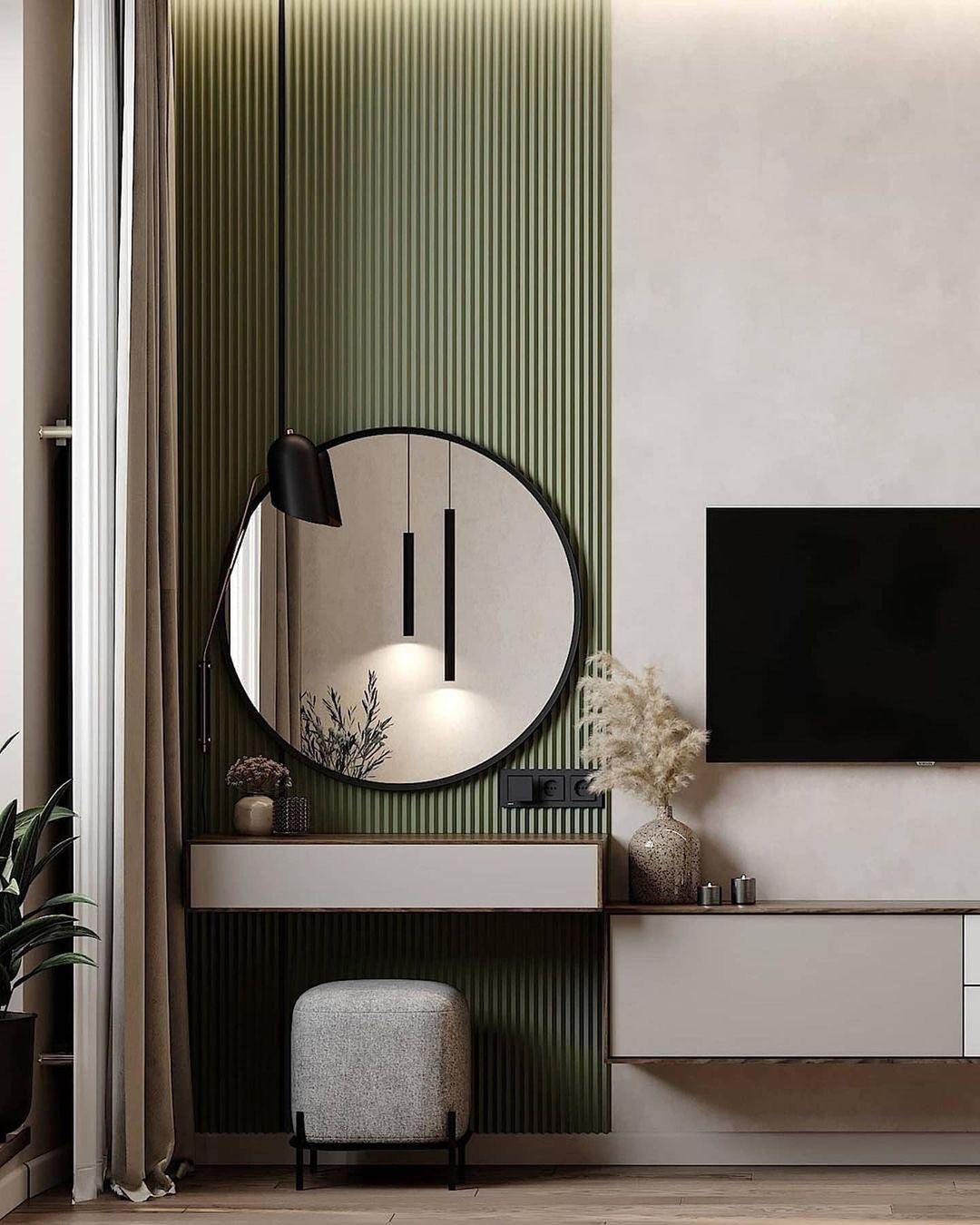 梳妆桌前的区域选用了绿色木格栅装点,文艺感满满。床尾墙面上还悬挂了一台电视机呢。