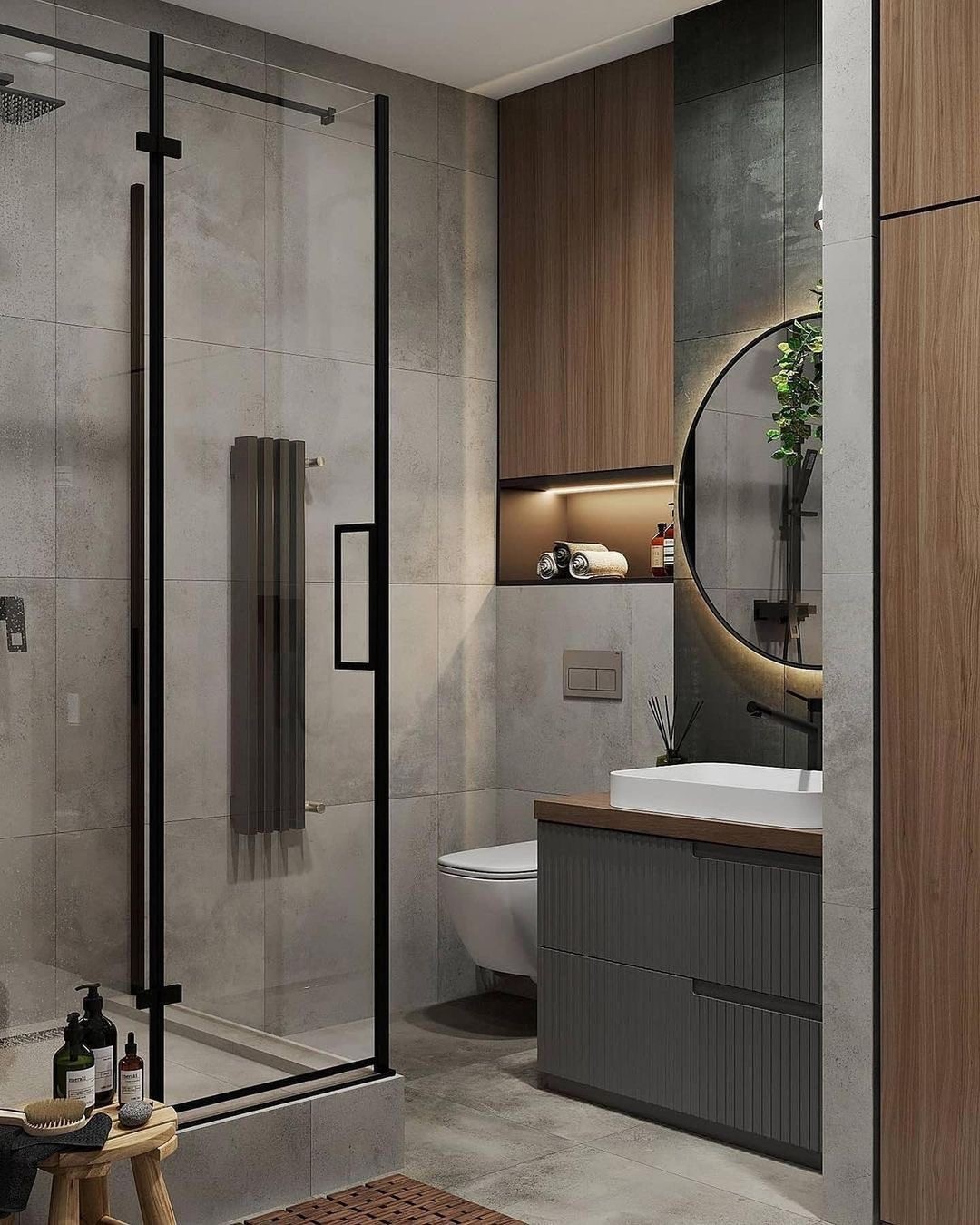 卫生间有用玻璃隔断隔出一个淋浴区。