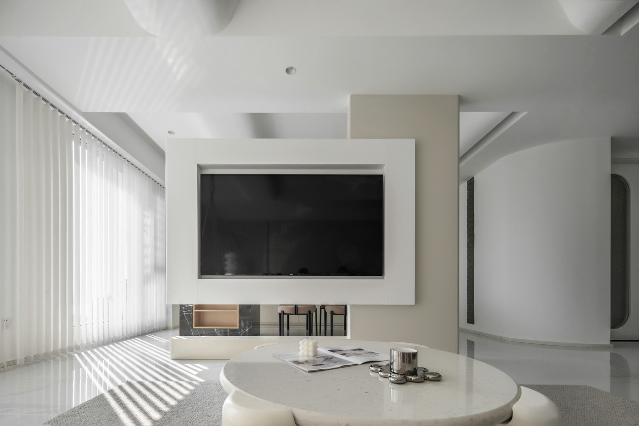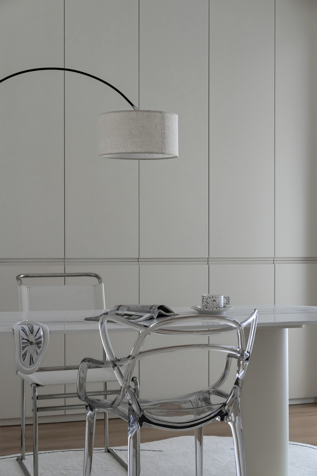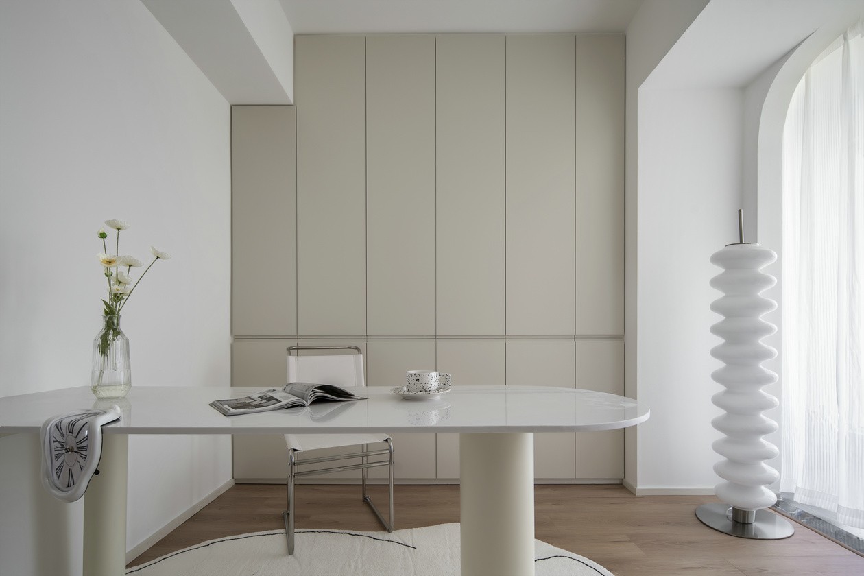 一个强调包容感的空间,从地面到天花板,是一次由重到轻、愈加松弛的演变。白墙朴实平易,低调含蓄,赋予空间可生长的留白。