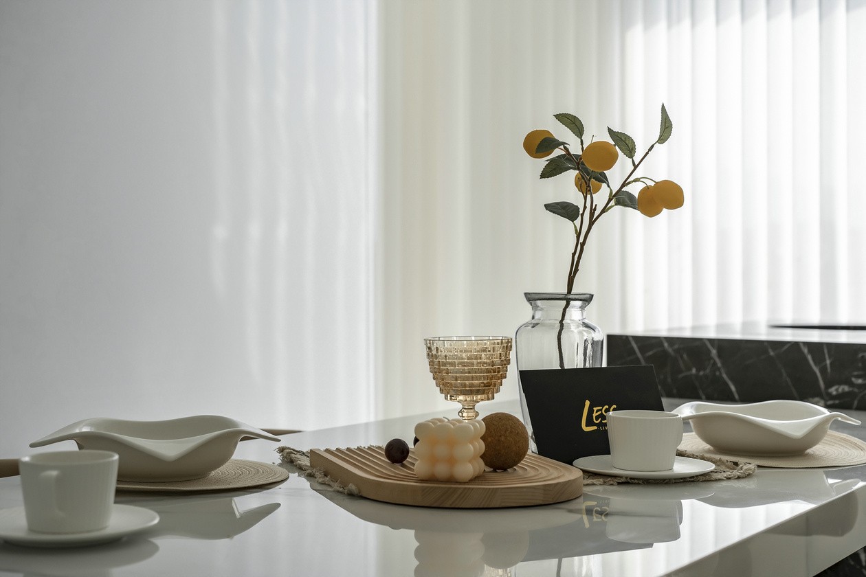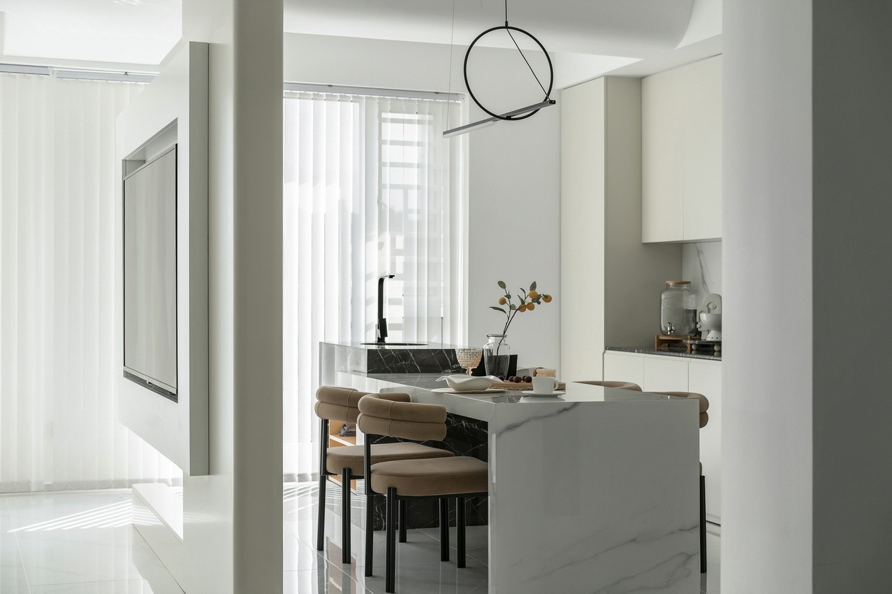金属、大理石与绒布的碰撞,彼此依存,和谐共生,将三餐四季浓缩于方寸之间,以跳脱、张扬的方式表达对生活的积极、热爱。
