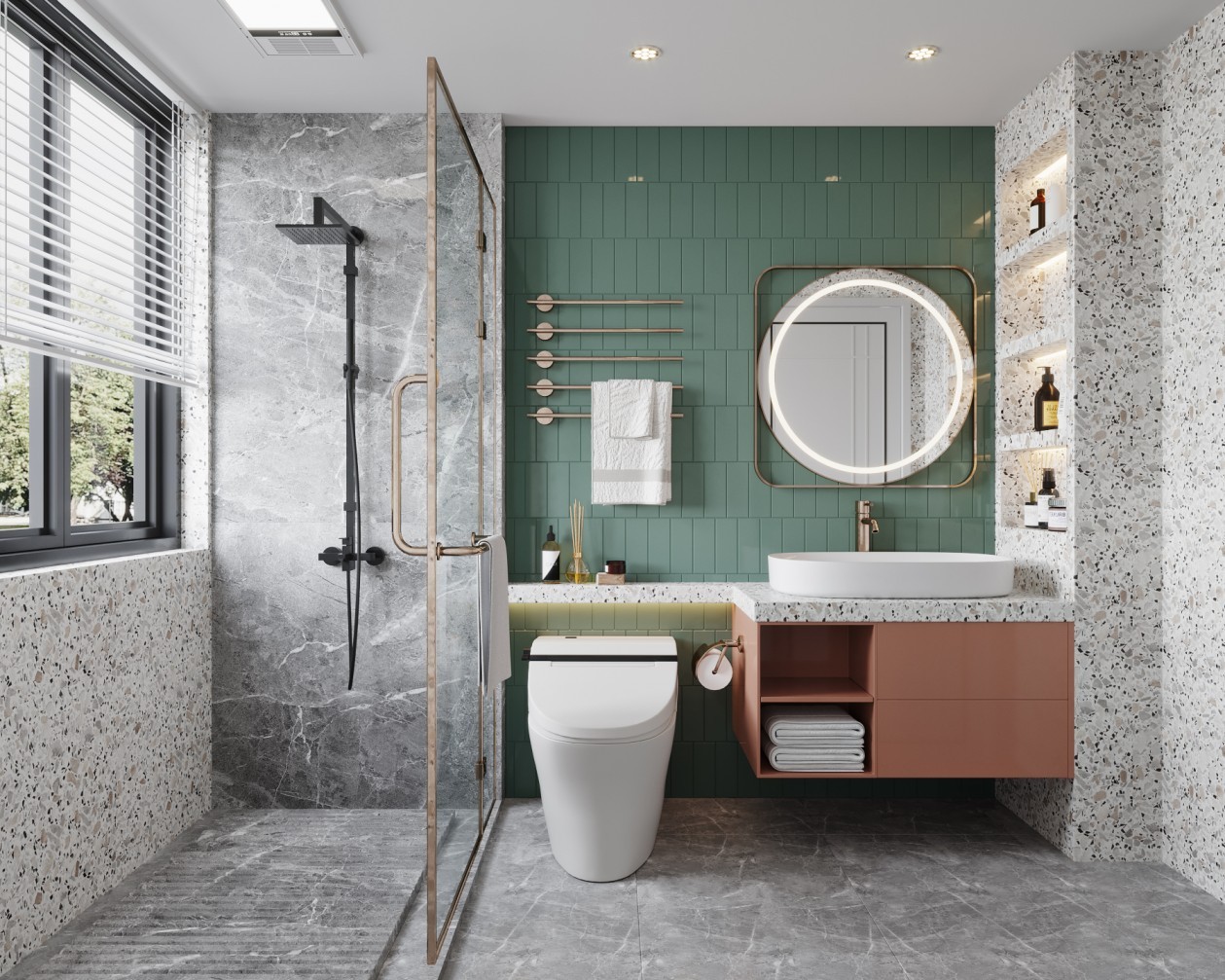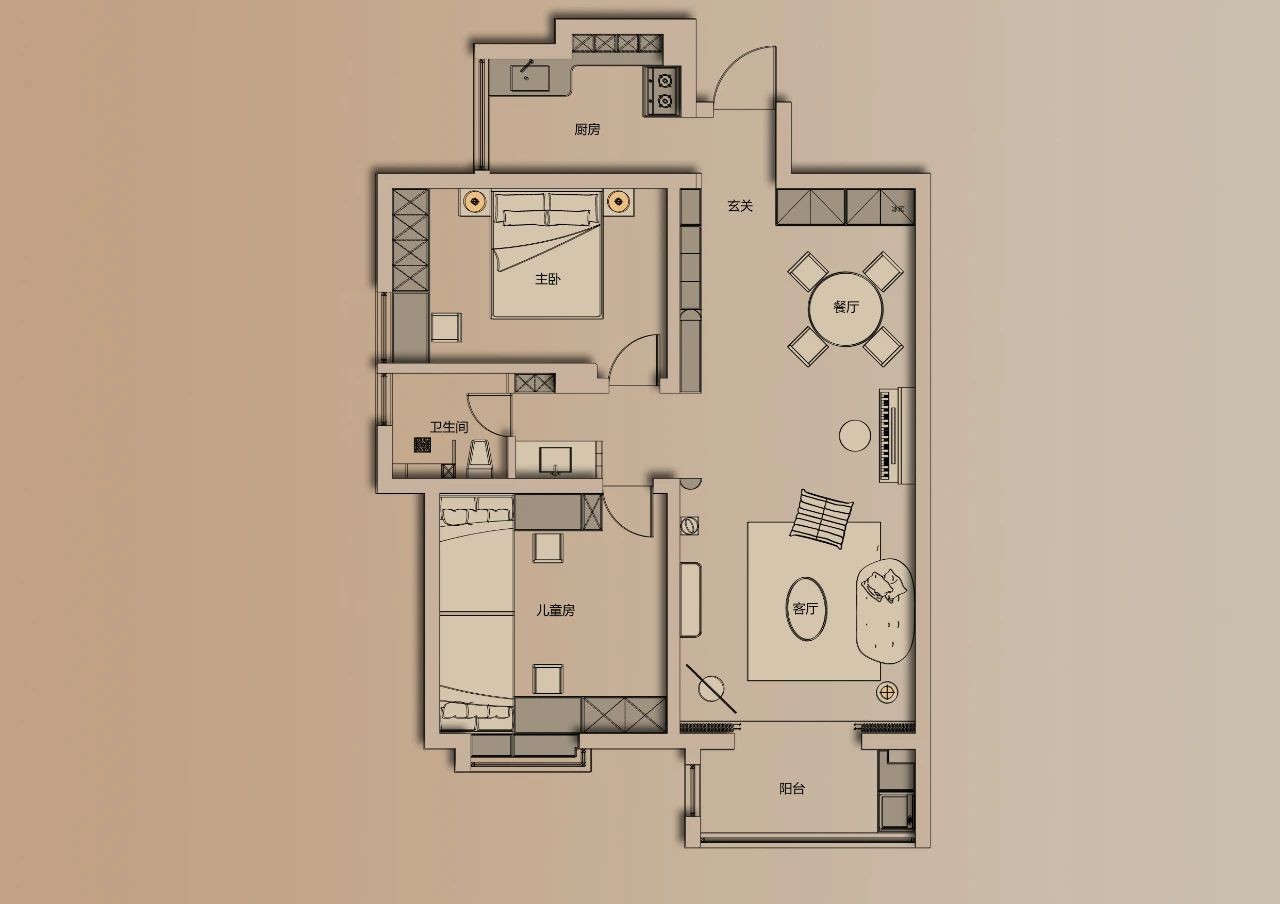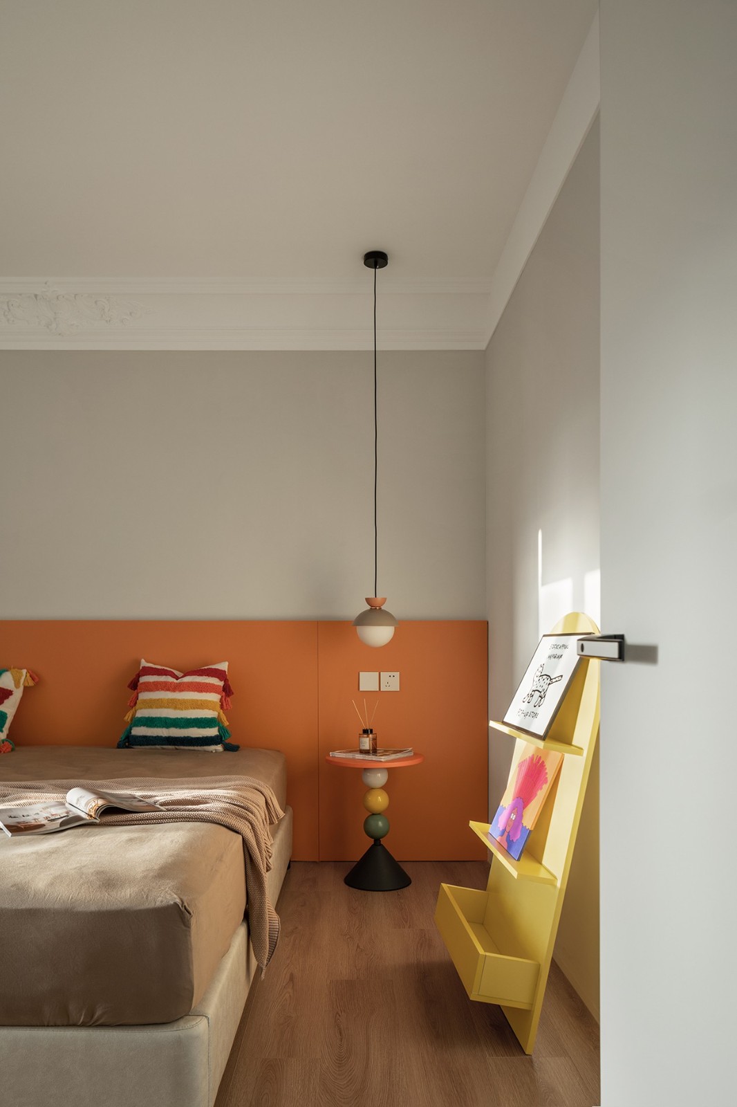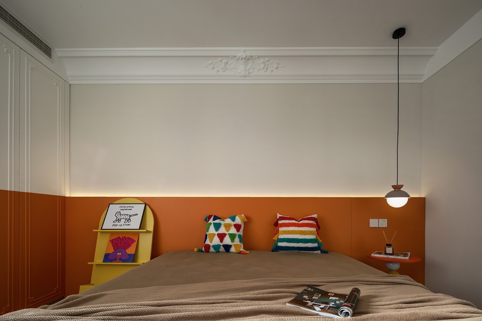 主卧渐走向私密性的安宁与舒惬,暖调棕领衔的统一性体验,便是其中的暗示。从客厅的开放性到卧室的静谧,整个空间如一出完整的戏剧,自前序的跳跃撞色,终到达缓和的落章。但风格与色彩依然延续,且提取零碎的片段,品位不减丝毫,情感归于怡然与自洽的放松。