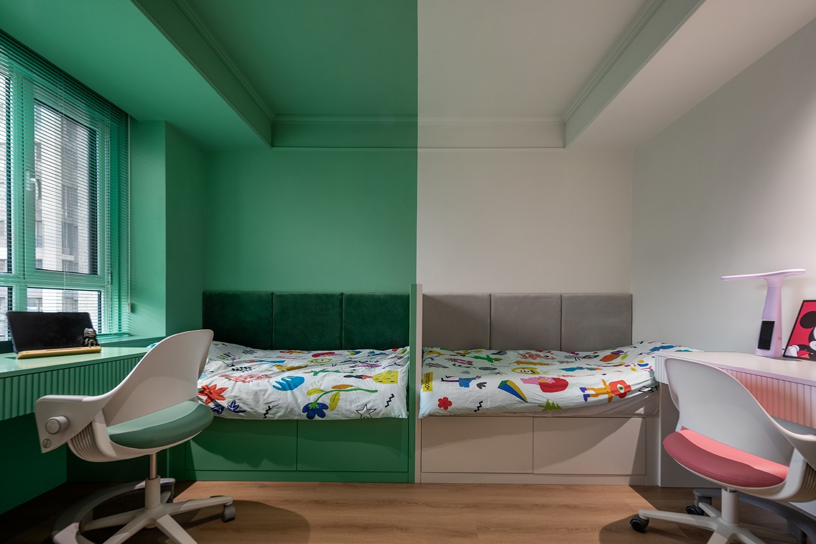 型格各有所爱,审美美美与共,一半是活力的绿,一半是奶油的白,两个孩子的偏爱,在同一空间中达成了和谐,各自拥有自己的私属领地,又没有割裂掉亲情的羁绊,这是家之于家人的意义。