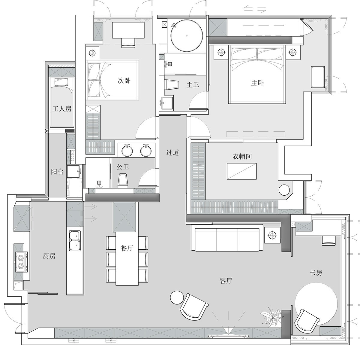 在简约的灰色空间中,金色和脏粉色布艺元素的加入,赋予了空间温度又不失格调。懒人沙发还可以移到阳台,享受好天气带来的惬意与慵懒。