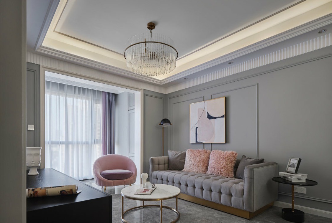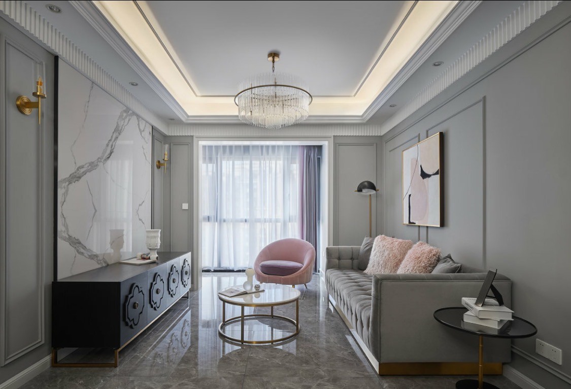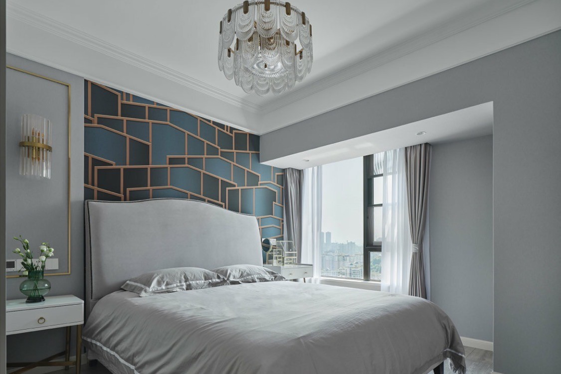 蓝色、灰色、金色,将轻奢感精妙地植入进空间,从而侧面表现业主对轻奢的喜好。