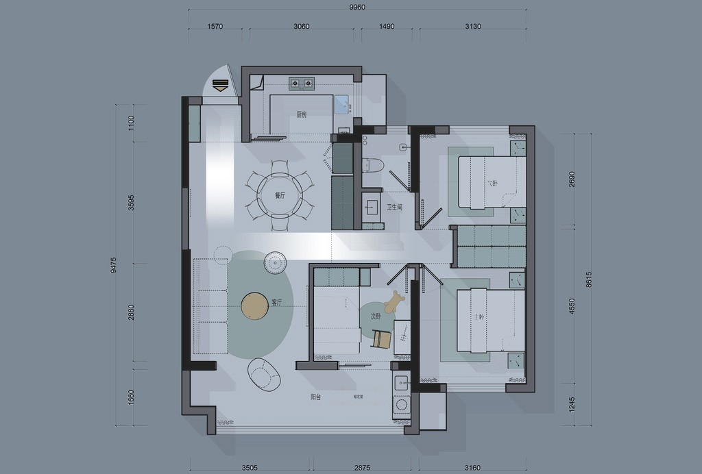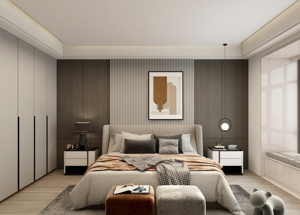 卧室咱们做的通顶衣柜,用的用的长门把手,床头做了两个小床头柜,可以放个手机之类的