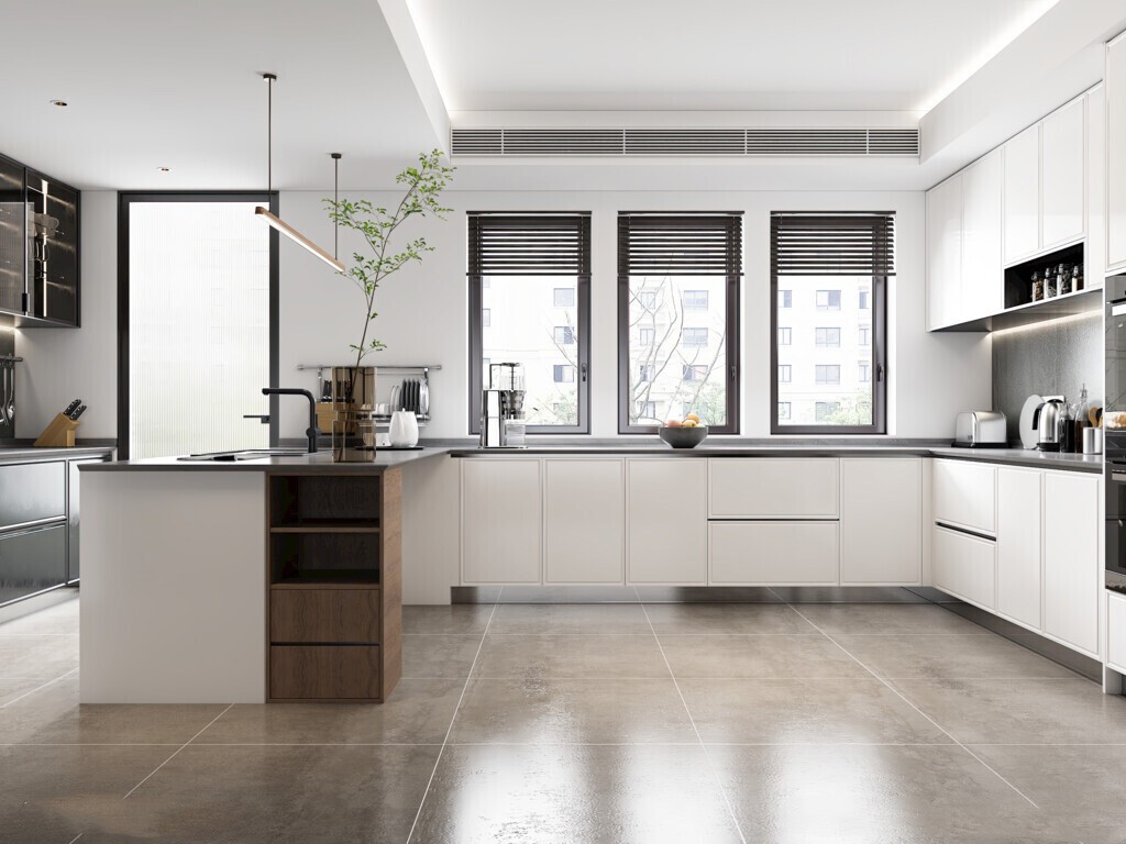 咱们厨房比较宽敞,做的白色橱柜,进门左侧做的冰箱 柜