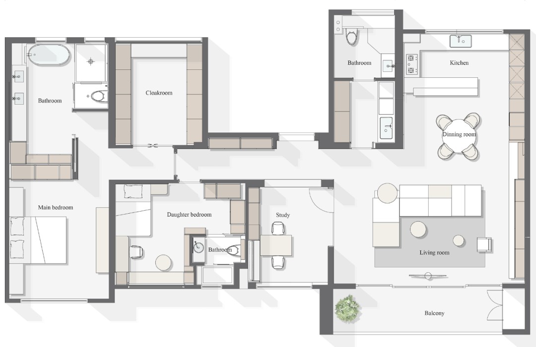 一体化的客餐厅,将空间的实用性和快捷性大大的提高,也许在忙碌的早晨,空间的快捷性便能被完美的展现。吧台割断了厨房和餐厅,简单的修饰,看起来十分的自然。