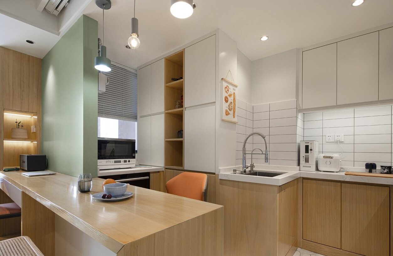 厨房地面六角砖与客餐厅木地板的碰撞,让空间气氛生动起来。