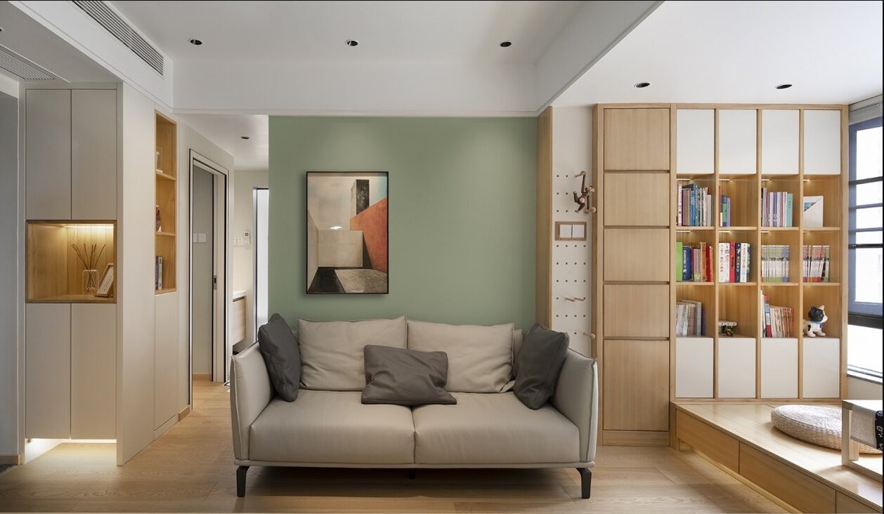 灰豆绿色的沙发背景墙在整个空间起着画龙点睛的作用,挂画靠在一边让墙体比例更加协调、舒适;木色的地板使空间更加温馨。