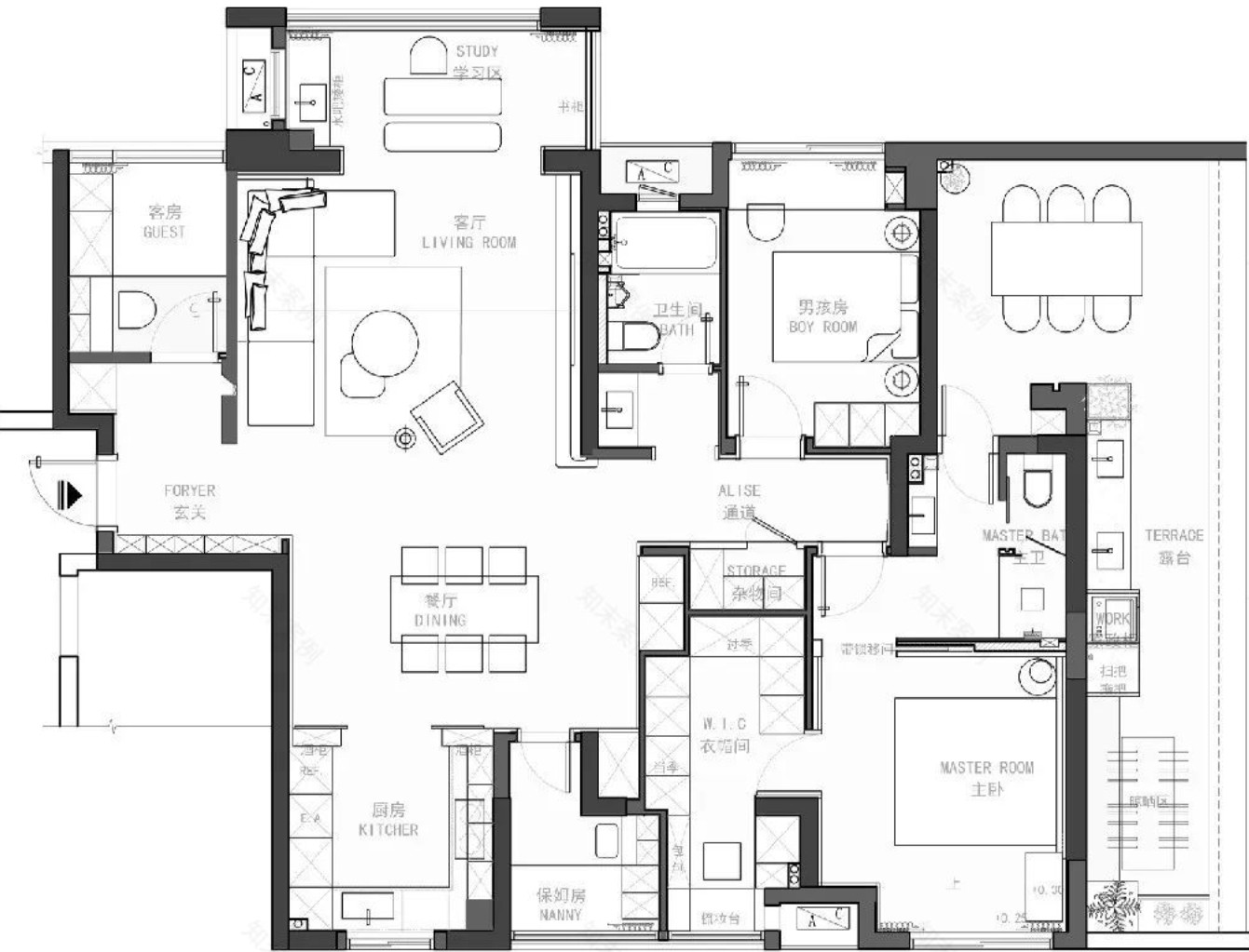 本案居住者为一家三口,近几年考虑二宝。需要4间卧室,主卧带衣帽间、男孩房、客房;晚上经常在家聚餐聚会,想要大的客餐厅,餐厅需要一个大长桌,需要大的收纳,***有一个储藏室