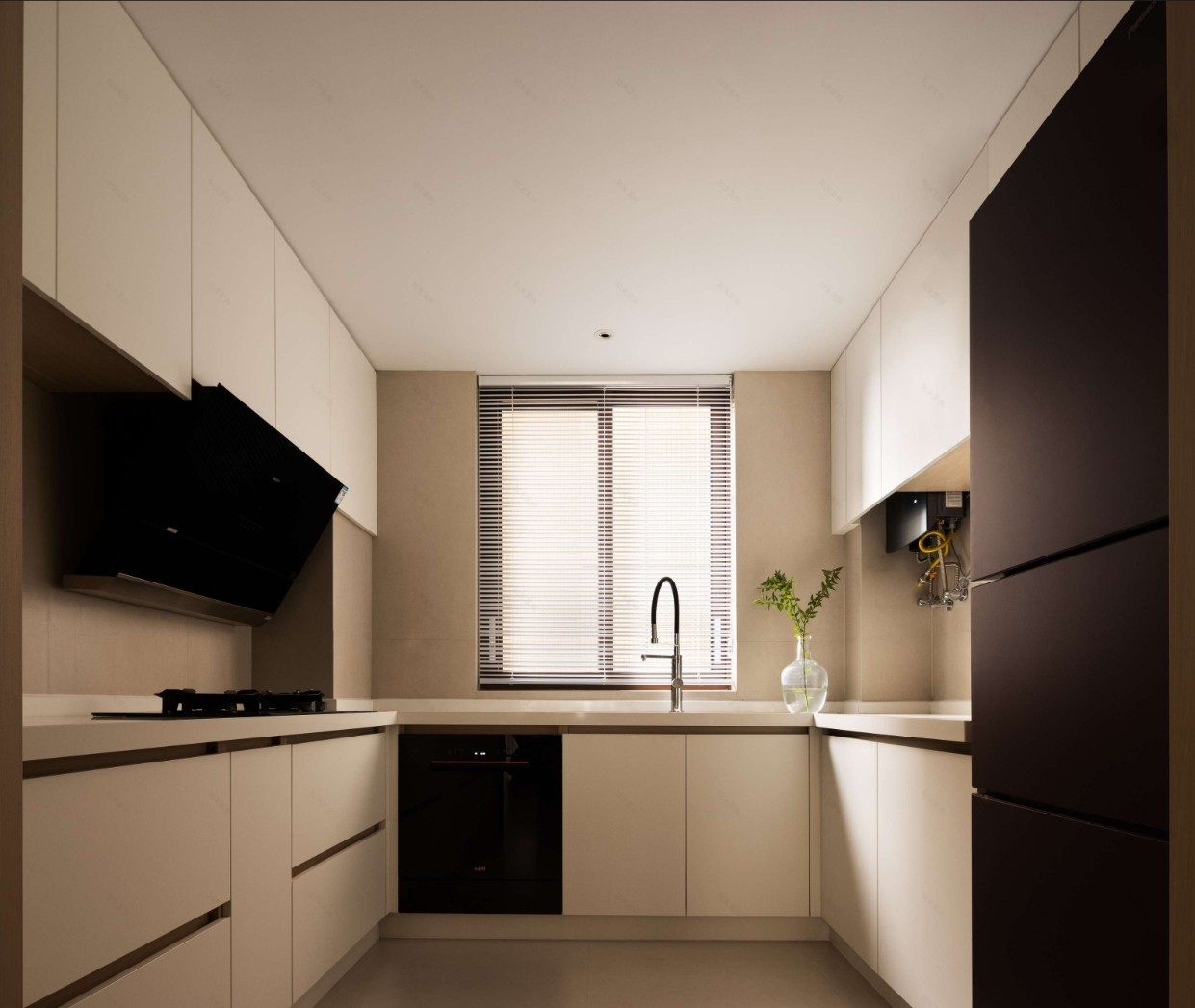 放式厨房与餐厅连通,橱柜选用了与客餐厅一样的奶油色系,整体更加统一,也在视觉上放大空间。U型厨房***作动线更加流畅,操作更加方便。