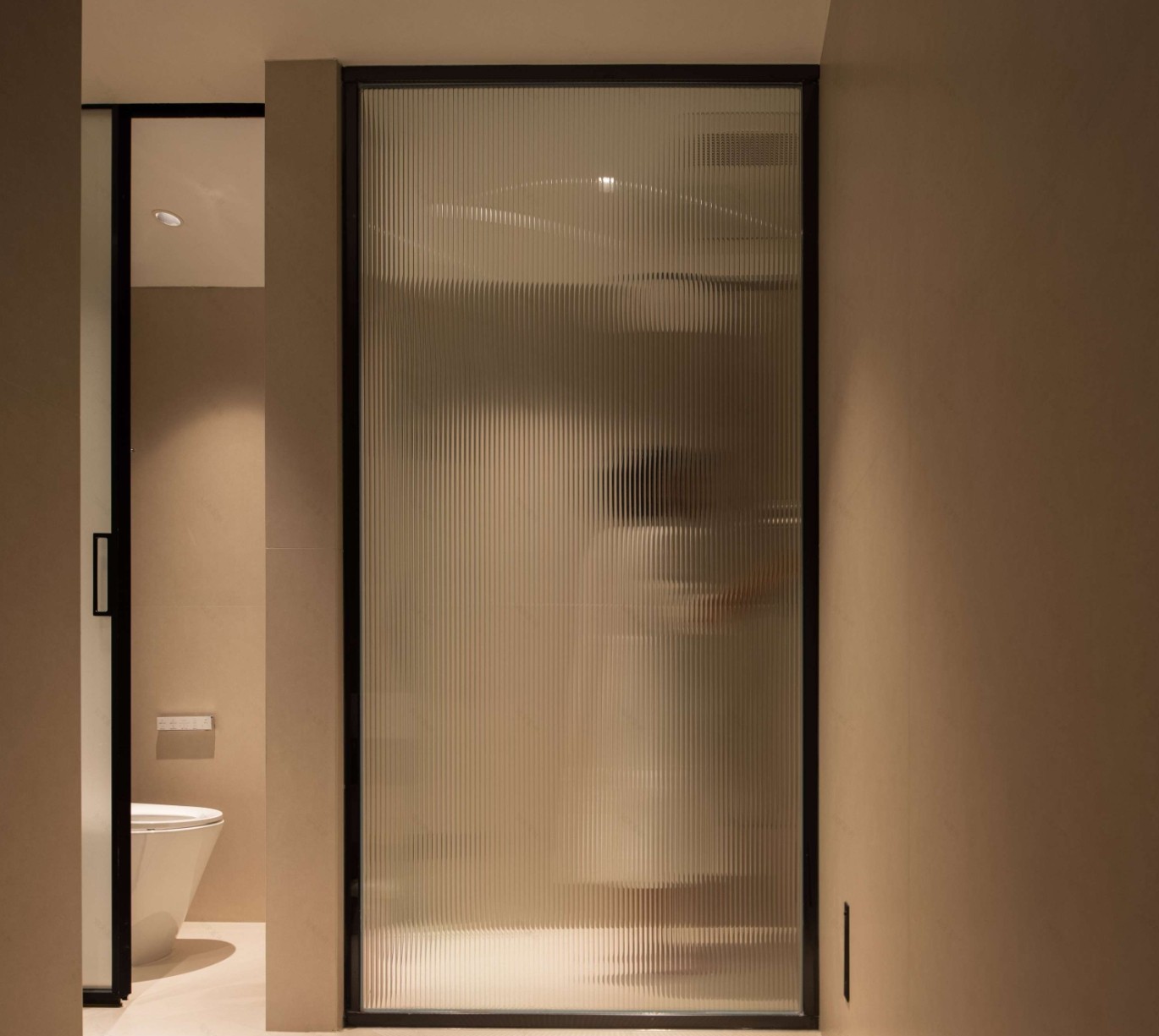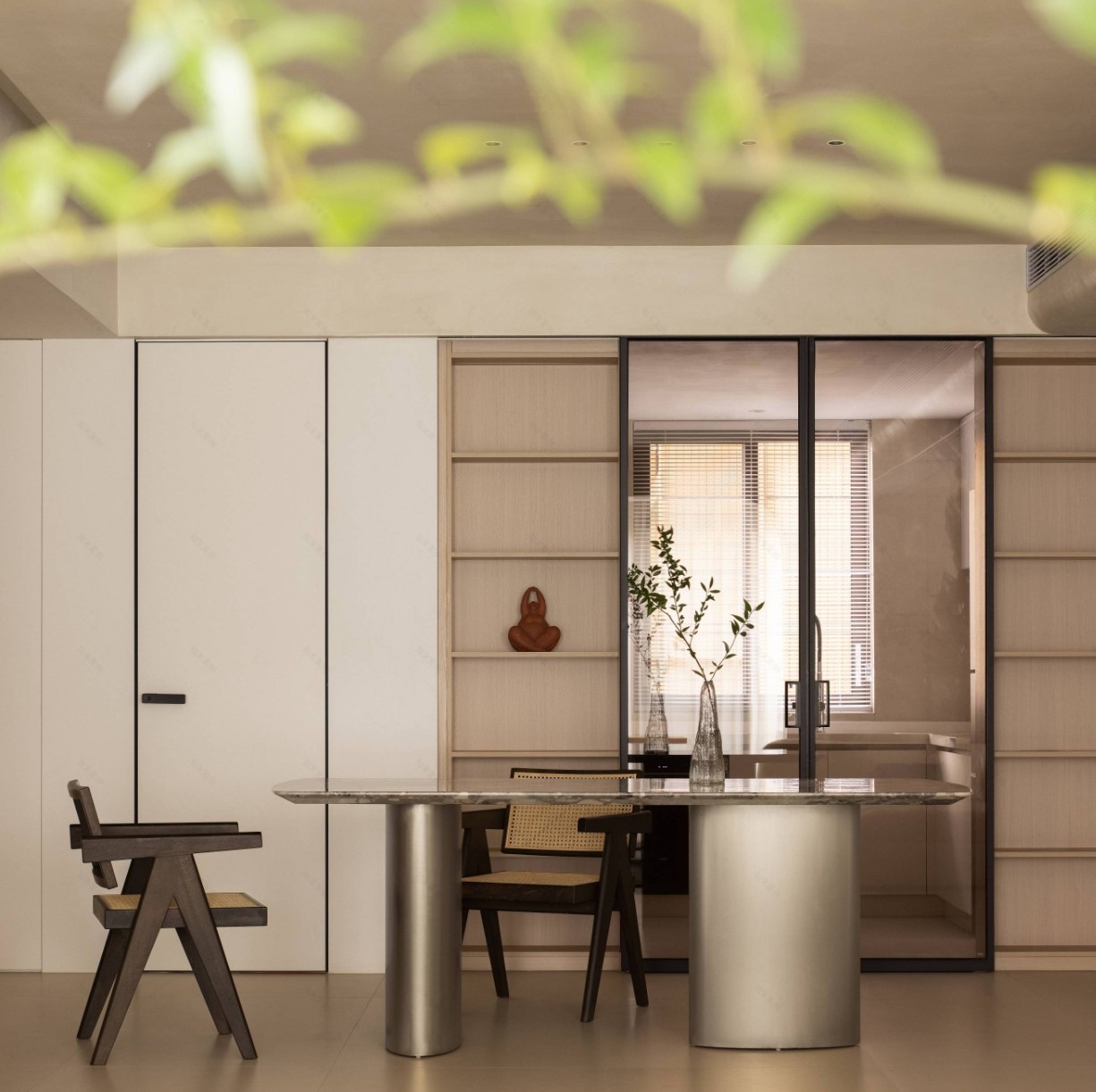 厨房门兼两个功能,隔绝厨房油烟与酒柜防尘,使门的意义不再单一。备用房间的隐框门让空间更加整体,黑色的边框又带了趣味性,昌迪加尔椅的稳重,让整个空间更加温润丰富。