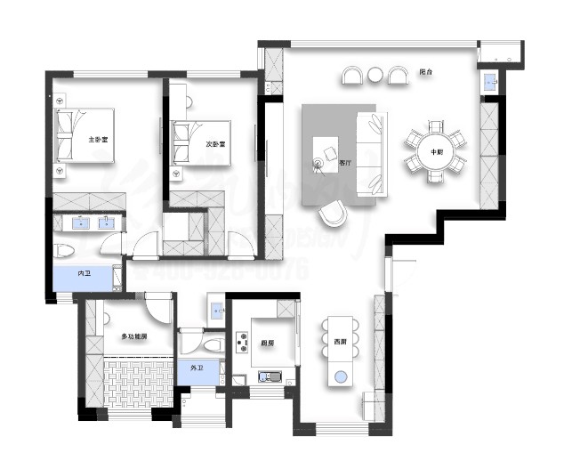 沙发居中摆放、客餐厅的结合都是为了迎合双阳台的明亮通透而做的调整,客厅的范围不再受立面拘束,而丰富的光景让客餐厅采景阔卓。