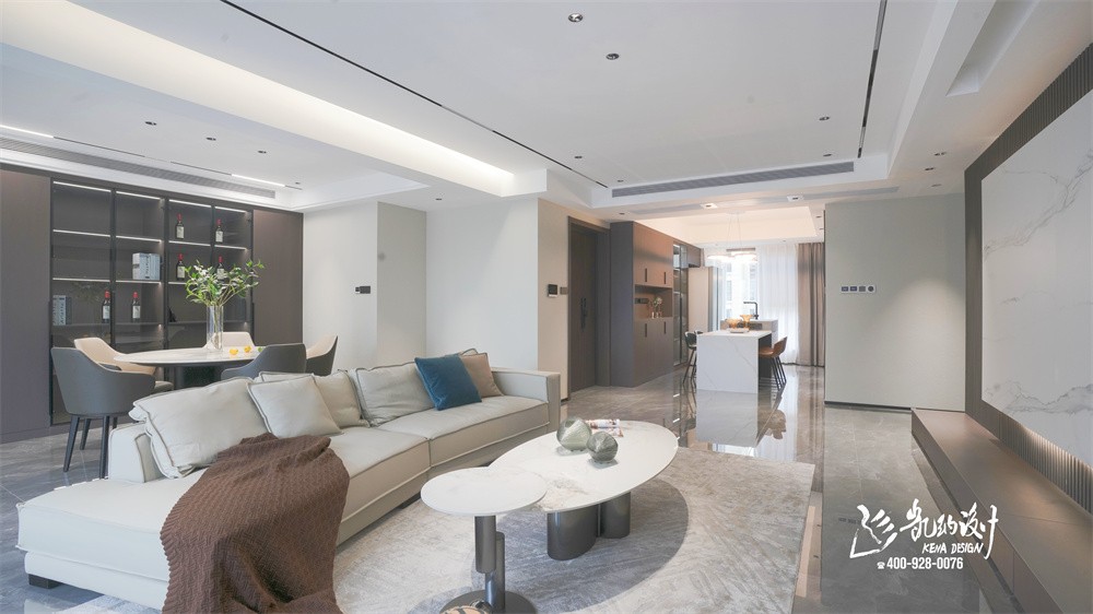 从入户即见明亮开阔的场域空间,奶白色的温和加上深色木纹的温厚肌理,带给客餐厅一种端静气质,给人一种有温度的沉稳质感。