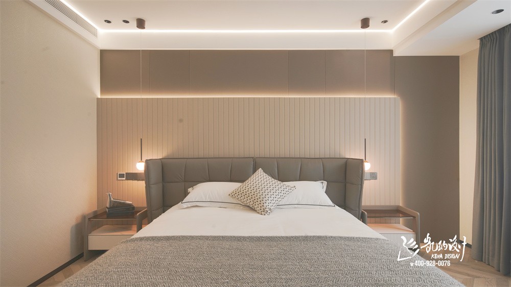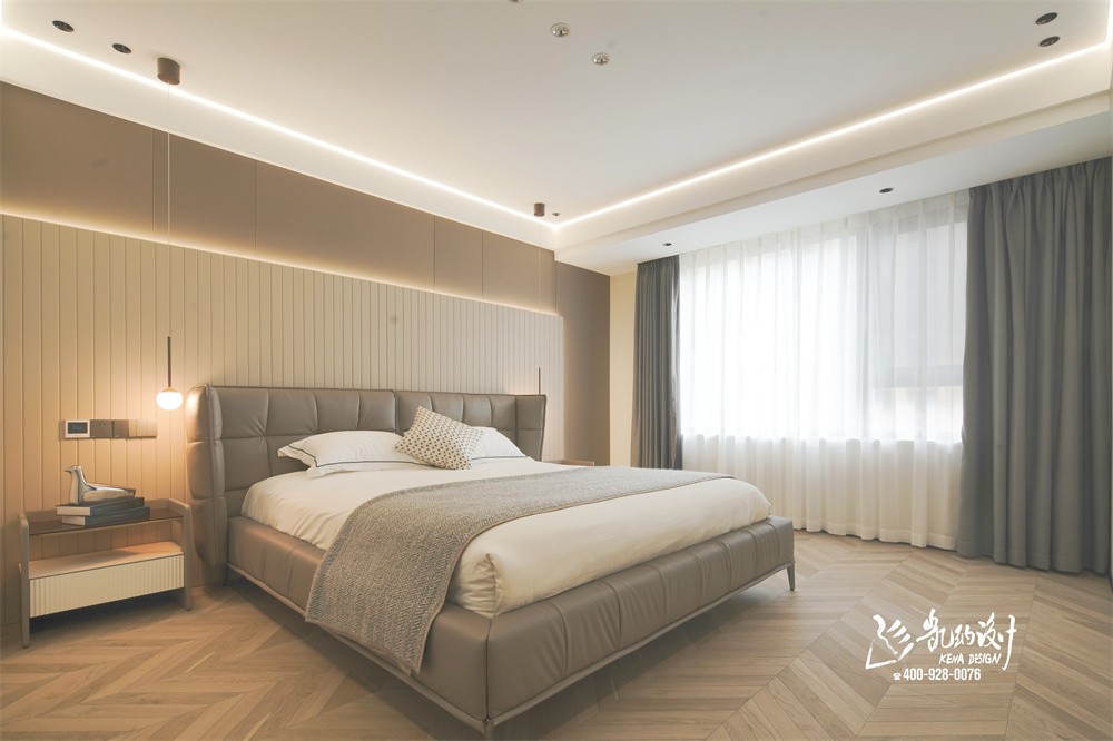 进入主卧室,线条纹装饰背景与木饰面叠加出层次,加上灯光的别样叠加,层次感让我们领略到艺术的秩序之美。