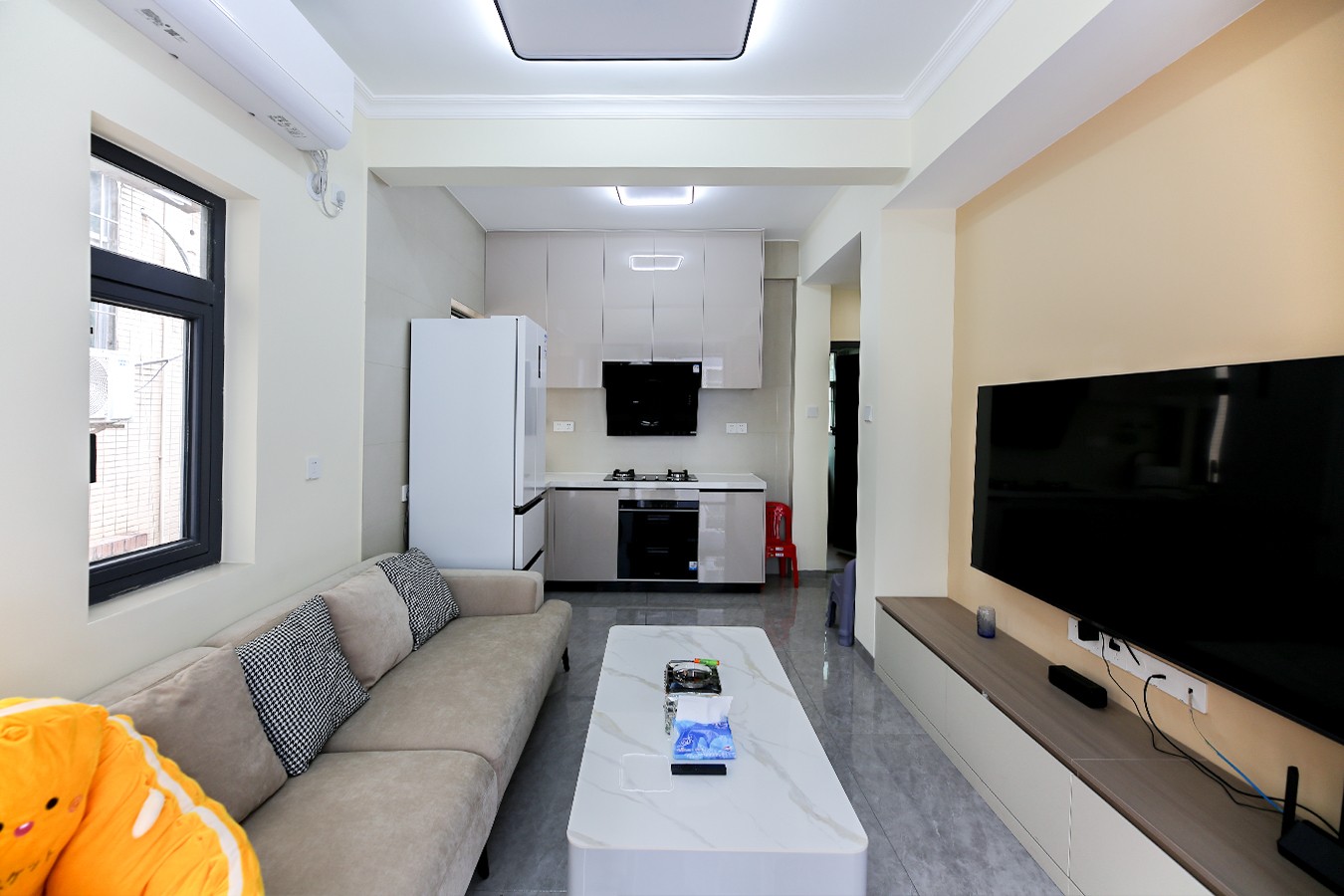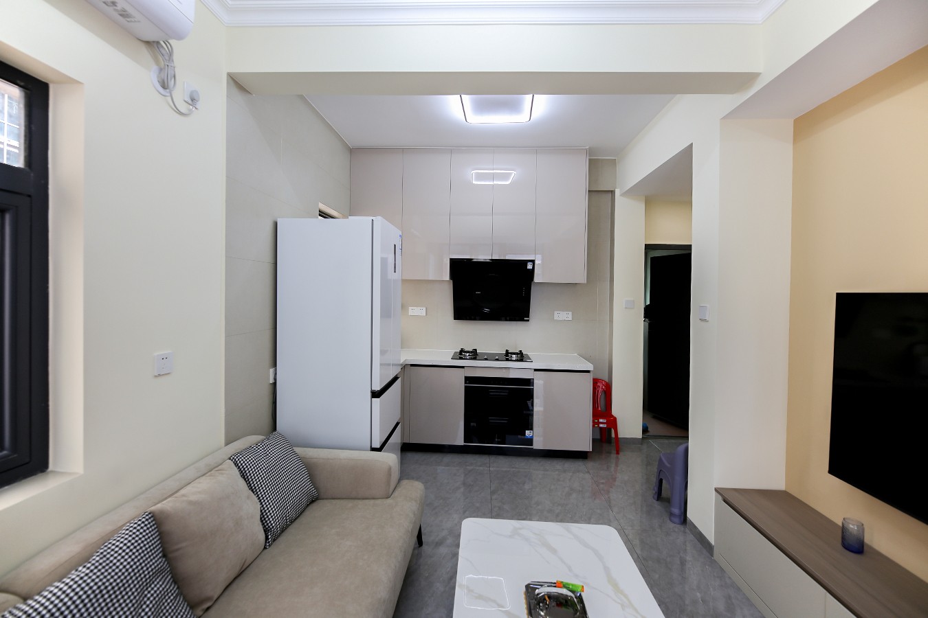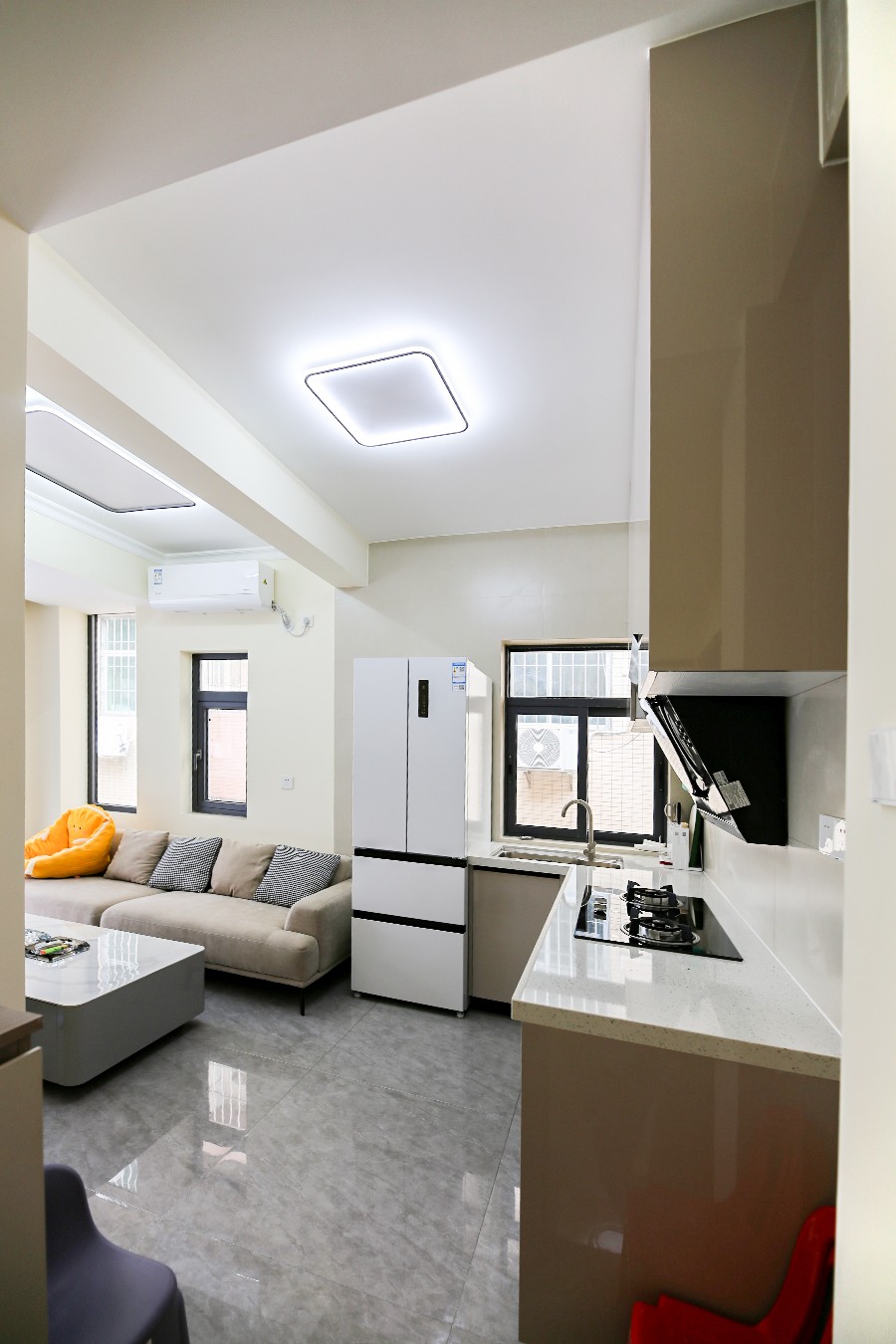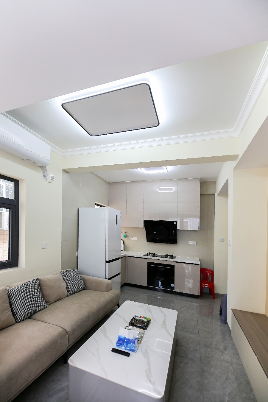 客厅与厨房两盏吸顶灯设计显得干净利落,电视背景墙涂刷淡黄色墙漆,不会显得单调,电视柜做了地柜和置物格满足基础收纳。