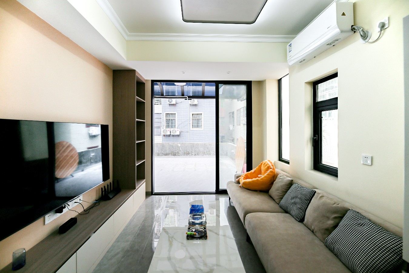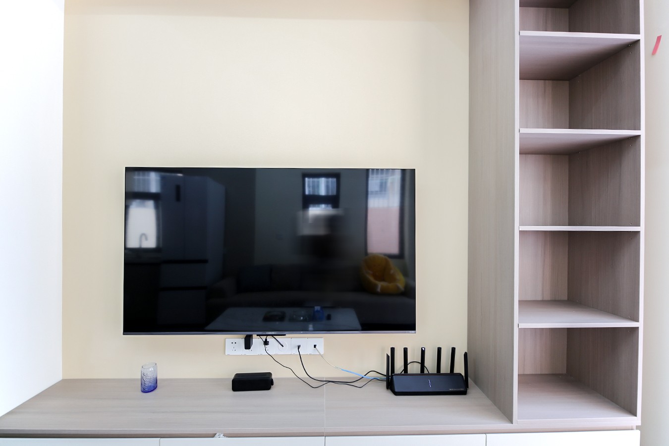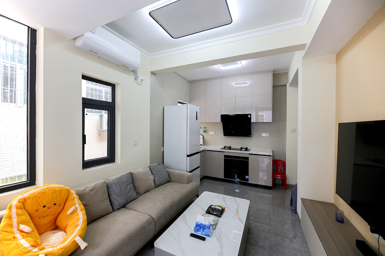 客厅与厨房两盏吸顶灯设计显得干净利落,电视背景墙涂刷淡黄色墙漆,不会显得单调,电视柜做了地柜和置物格满足基础收纳。